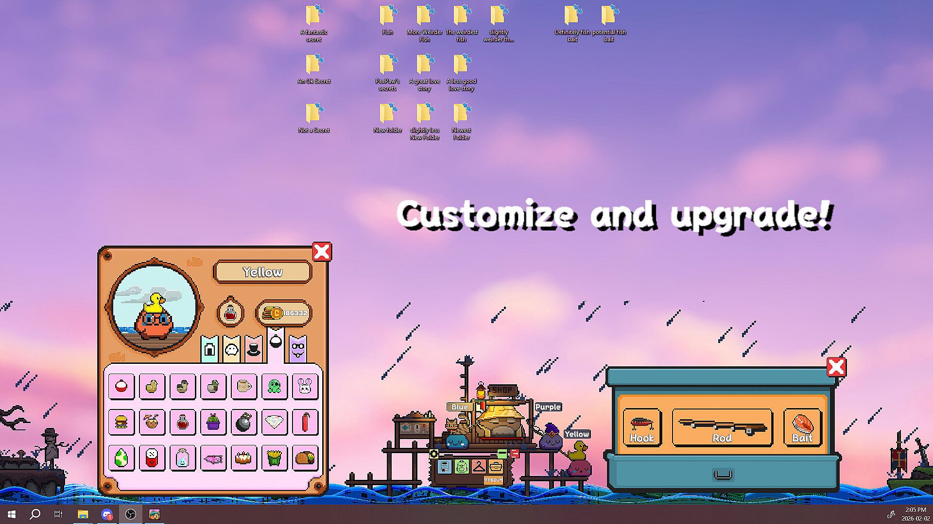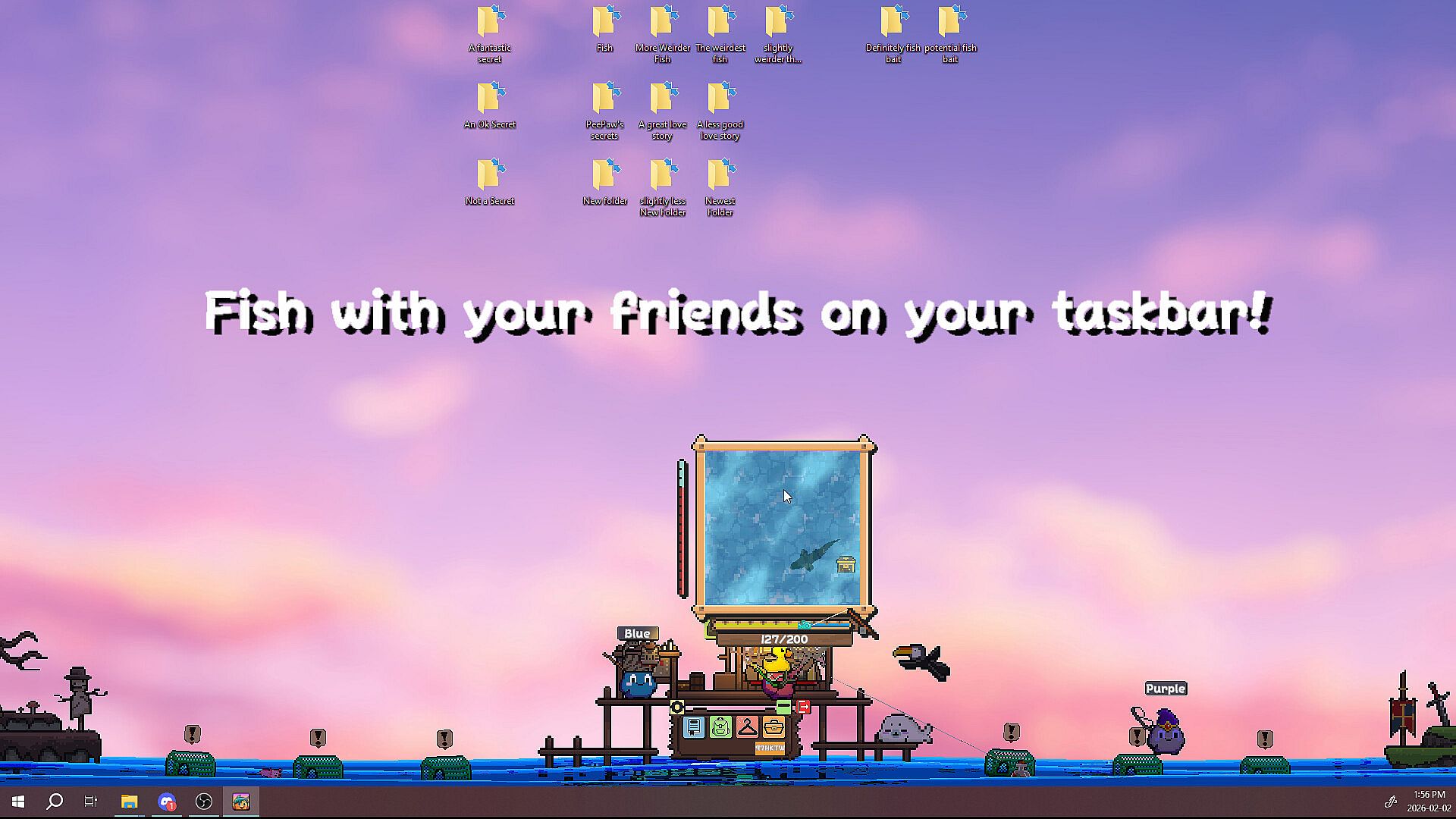 Invite friends to a cozy world on your taskbar to collect diverse species of fish, meet shopkeepers, and discover treasure. Show off your individual flair and accomplishments by customizing your character and dock. Oh, and be sure to say hello to any unexpected critters that might visit!