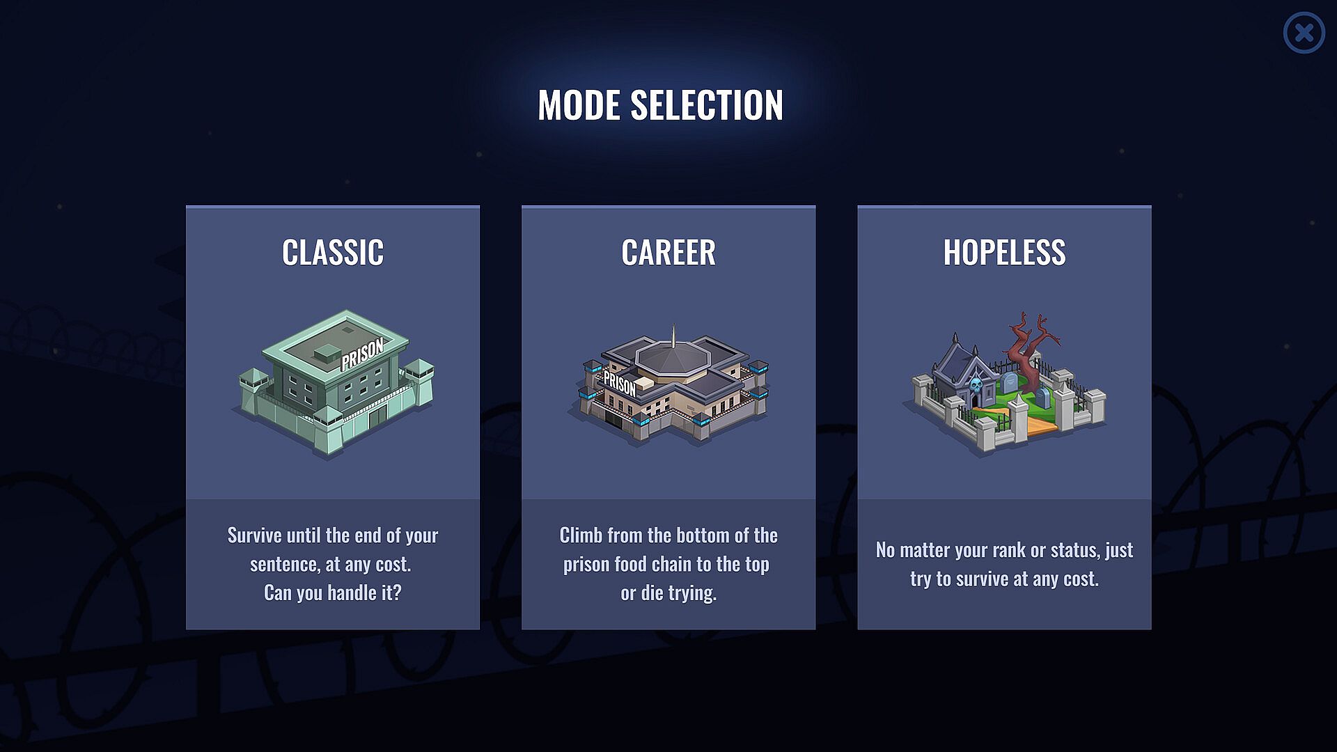 At the start, you receive a randomly generated inmate with a unique set of stats, a crime, and a sentence. You must balance survival, maintaining your reputation, and achieving the objectives of your chosen game mode.