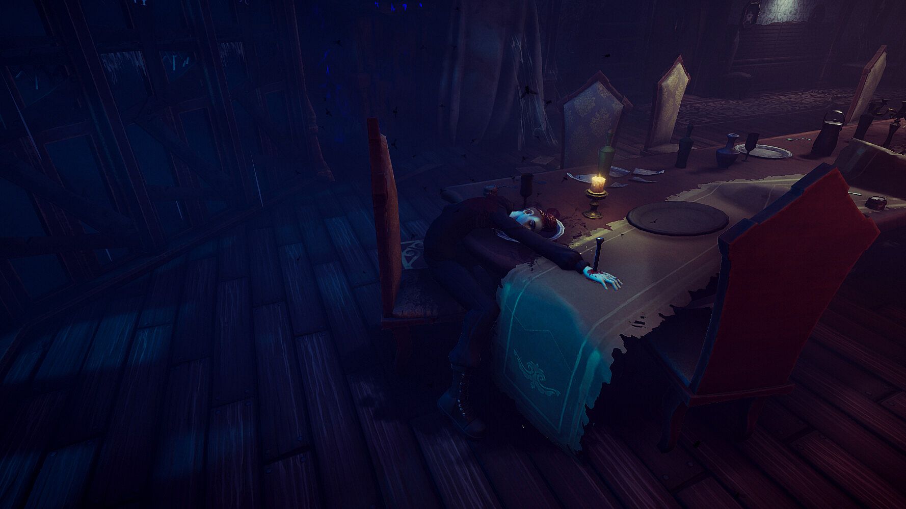 Escape by solving randomized puzzles in the mansion, or simply completing a hidden ritual that will get you out of the mansion.