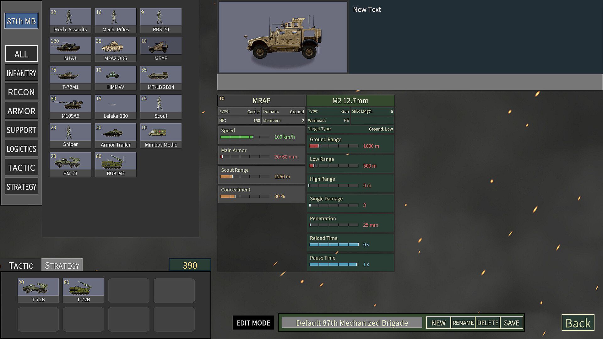 Group member system: allows a group unit to manage multiple subordinate members, such as an infantry squad, whose subordinate infantry members will all have independent states and health, avoiding situations like in some games where only the last person in an infantry squad can fire three weapons at the same time. The units expected to implement the group system include: all infantry teams, artillery groups, BUK air defense units, drone pilots, and personal carrier groups (allowing two Humvees to carry one 8-person infantry squad)