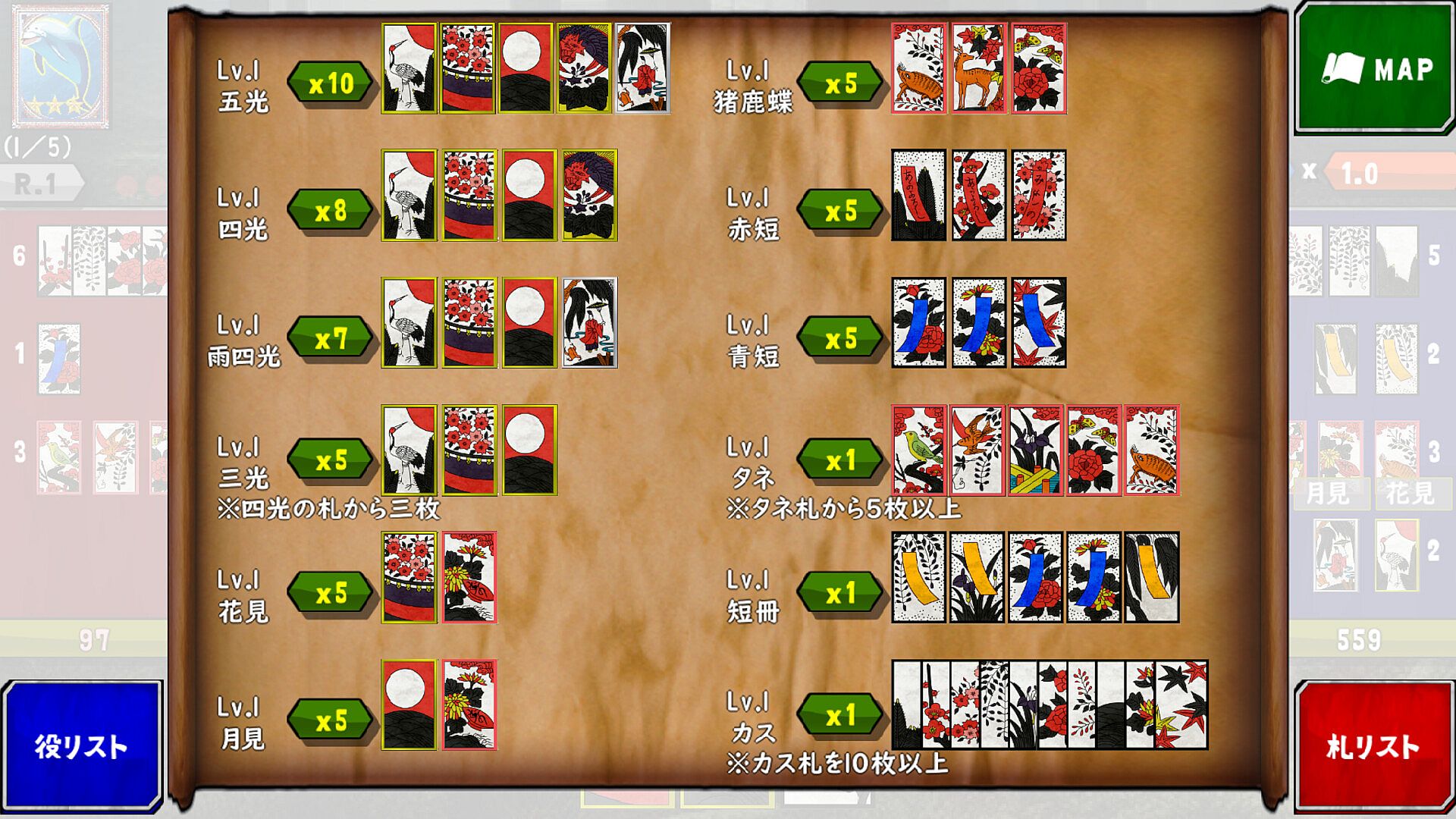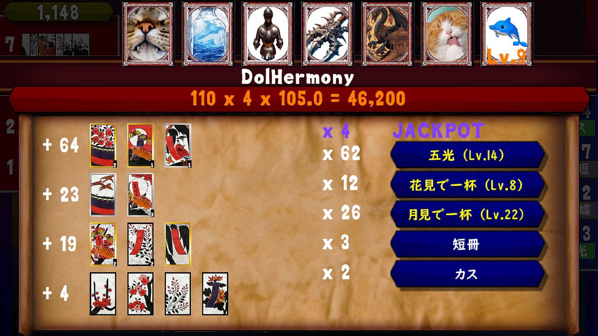 • ジャックポット:こいこいしたときに溜まるカウントでダメージ計算時の倍率として扱われる。ただし、敵が上がる時のダメージ計算にも適用されるの注意が必要です。