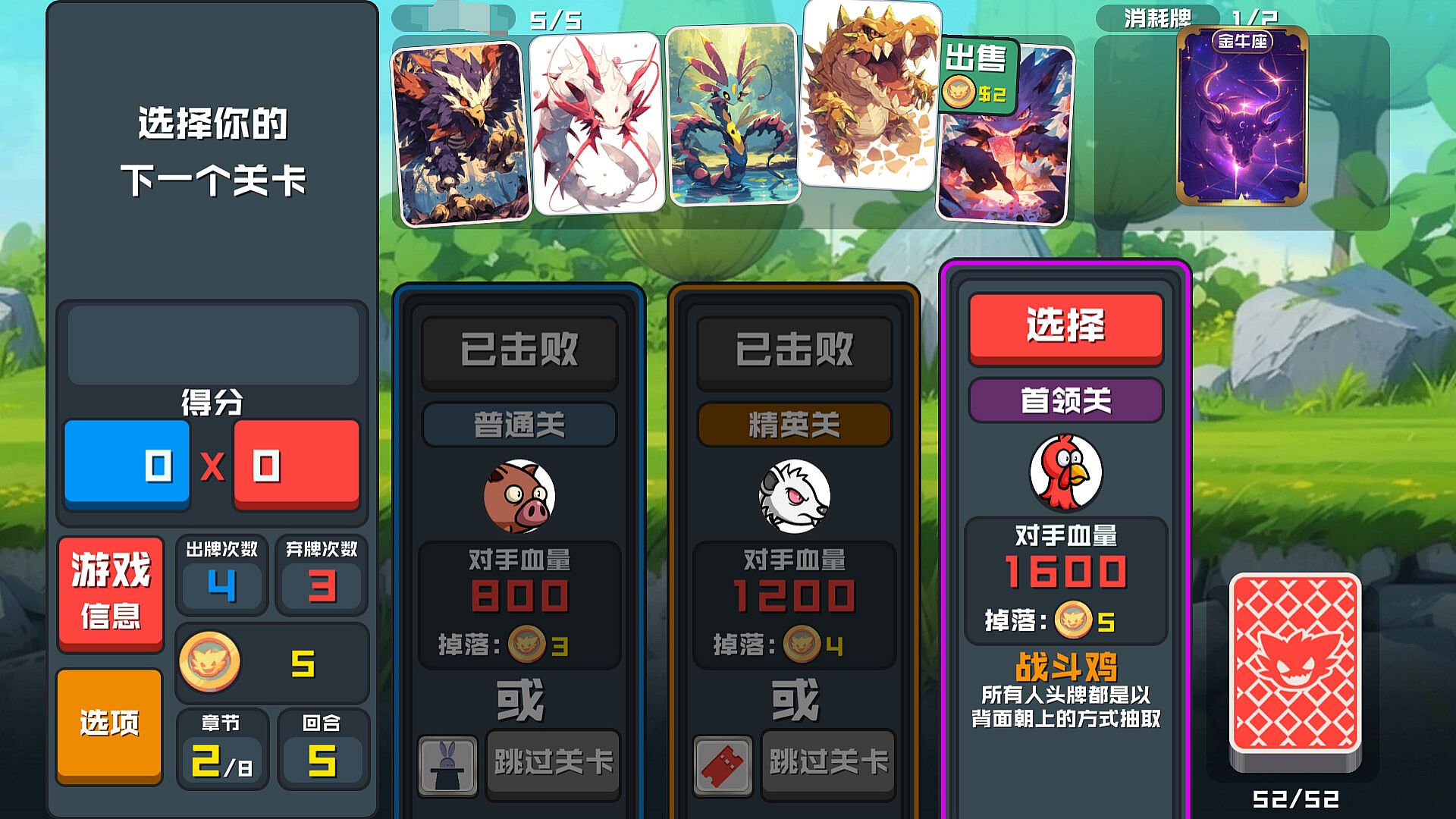Phantom Beast Solitaire is a casual puzzle card game. Each start will have a different beginning. You need to defeat monsters through the cooperation of game cards, beast cards, constellation cards, and magic cards to complete the level. If you fail to defeat the boss within a limited number of shots, it is considered a failure. There is no time limit set in the game, and you can carefully consider before making a shot decision. Based on the basic score of the card type played, you can accumulate the special effects of the phantom beast card, plus the bonus of the constellation card, and finally calculate the final damage of this shot. Reward coins after clearance, which can be consumed in the store. The store sells privilege cards, pet cards, magic cards, constellation cards, and enhanced game cards, as well as special card packs. Of course, the cards sold in each issue of the store are different. Only by seizing opportunities can we achieve ultimate victory. The card pack is also a one choice setting, allowing you to easily choose the card you need the most. Various different gameplay routines are worth exploring and contemplating. Even after completing the game perfectly, you can continue and fully enjoy the fun of challenging yourself in the game.