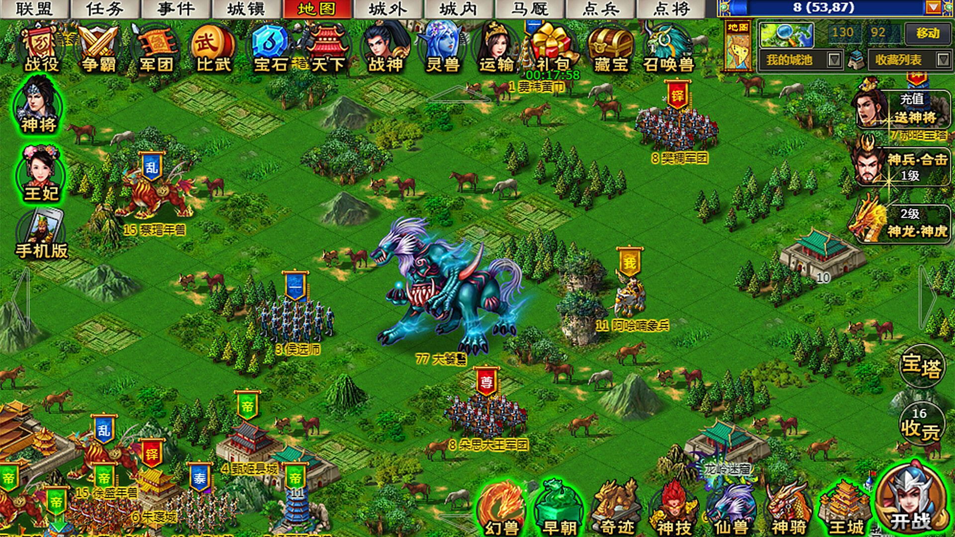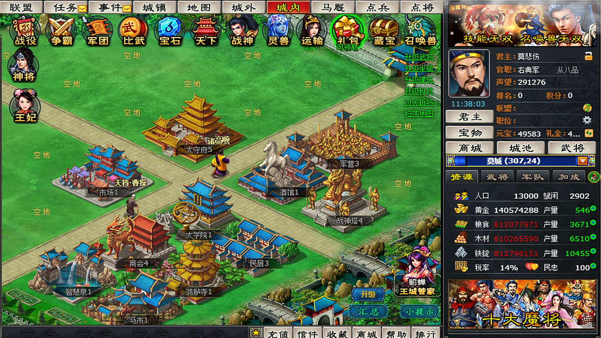 【王城】可免费招募神将、召唤神兽、招募天将、抽取神装、武将修仙、虎象坐骑。