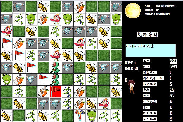 Player need to evade injuries from harmful animals and keep both health value and physical strength value above zero. Female leading role is rescued when five boss monsters are all defeated. Luckily,three pets with unique Recovery Capacity are willing to help. A puzzle of insert flags into grassland to find clue needs to be solved before the current level boss monster to show. Player can move to the block where boss monster located and press space key to attack him or make a strategy to kill him faster according to his fight method and movement rule. Ground worm Boss can be hurt by stake which is sold in the middle of the map. Wind Boss blow down stakes and gopher Boss place bombs. Stakes and bombs can make or evade damages, also they can be captured and replace in any place.