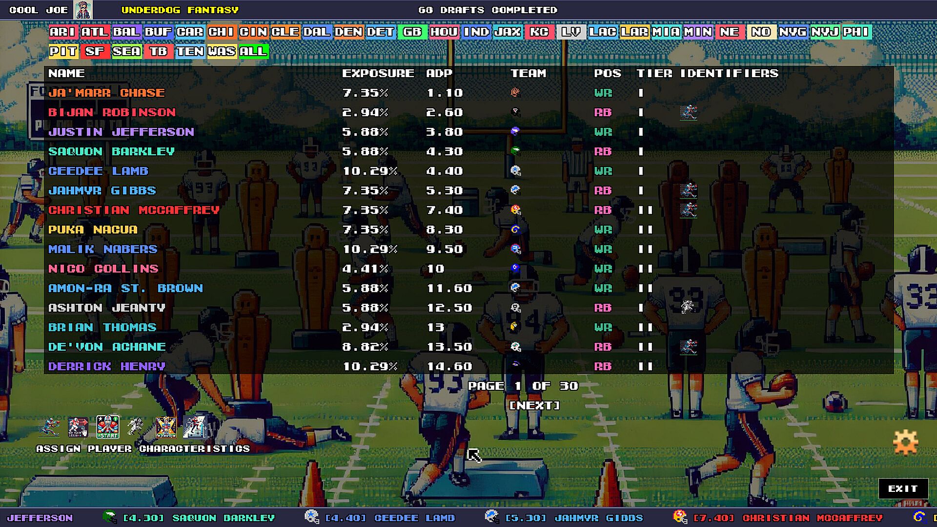 The Players section lets you view and manage your entire player pool within the GUI. You can tag players with specific characteristics – such as Rushing Quarterbacks, Receiving Backs, or Faded Players – and your preferences will be respected throughout every draft.