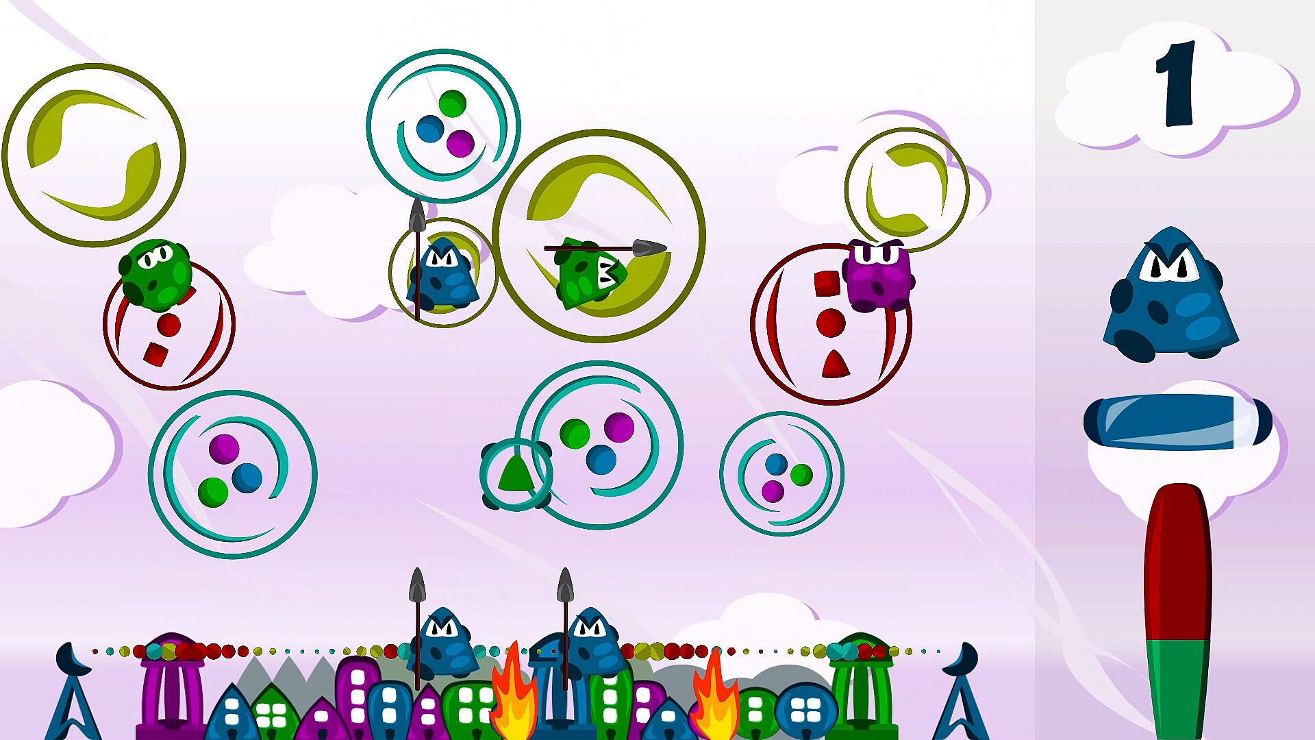 No worries! Create bubbles in the sky to transform all meteorites into the pattern given by the weapon and hunt them! Change their shape, color and rotation and save the city!