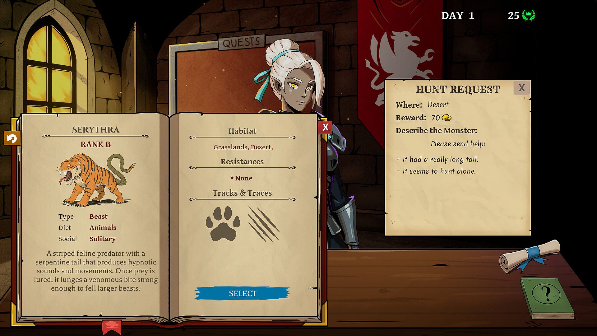 Your job is to identify the monster being described in a request and determine if a hunter is capable of slaying it based on their skill, weapon, and personality. Every quest demands something different, and the things to look out for grows everyday.