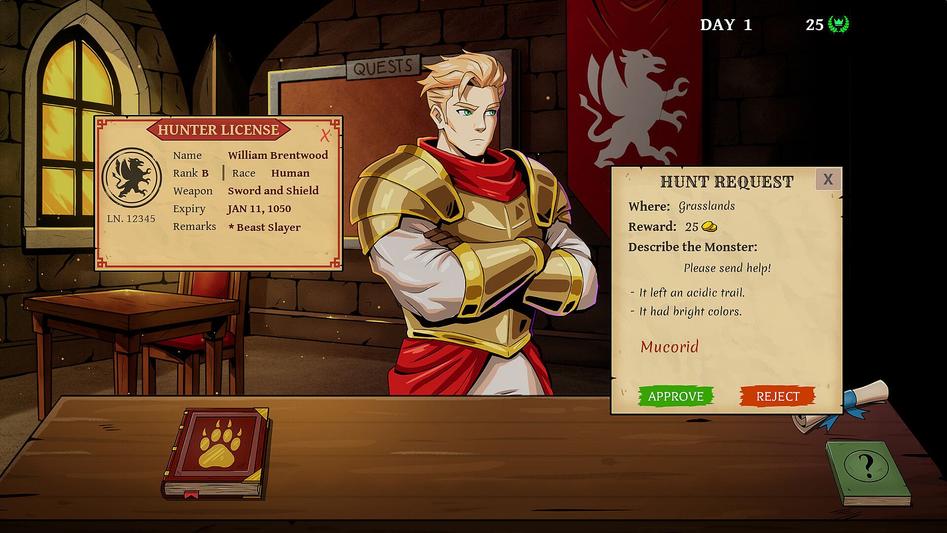 Youāre not the hero slaying dragons, you just decide who's foolish enough to try! While the guild's reputation is in shambles, every hunt you approve could rebuild its glory... or bury it further.