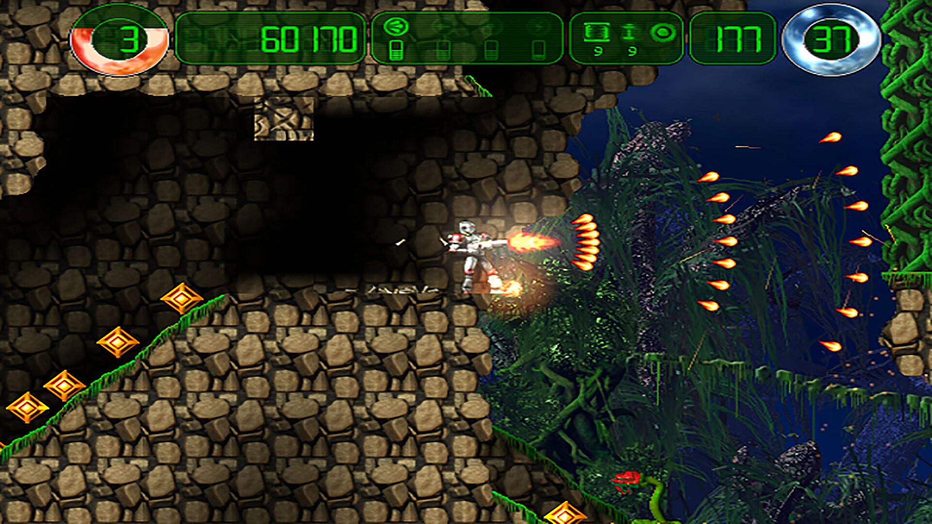 Blast your way through myriads of enemies, uncover the secrets of nine massive worlds, and collect tons of power-ups to increase your firepower in this highly explosive run-and-gun arcade game.