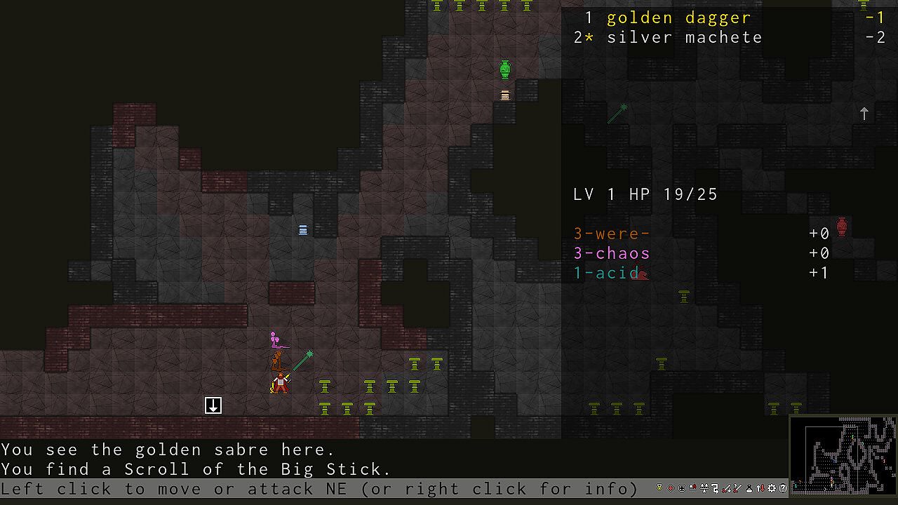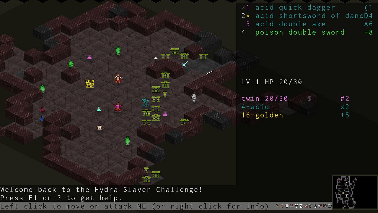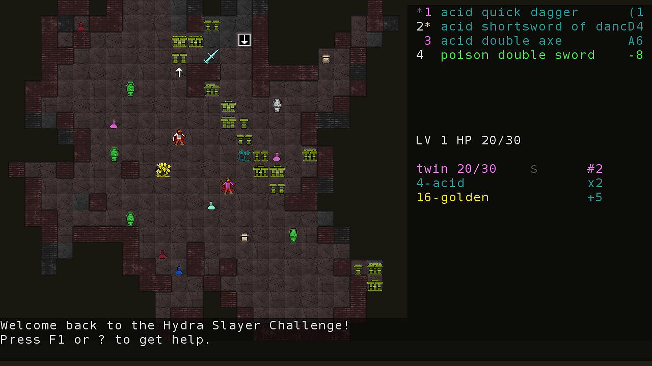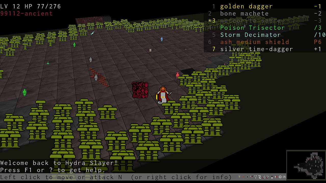 Hydra Slayer currently features a tutorial, 5 player character races with distinct characteristics, 28 enemy types (10 common hydras, each in two varieties, and 8 special enemies), 28 types of equipment including rare artifact weapons with special properties (not counting material and size variations), 15 weapon materials, 18 types of magical items which help you in your quests, three game geometries to choose from, 8 level topologies on very deep levels (including the Möbius strip and Klein bottle), 11 level generators, two endings (a small victory for quick challenges and more casual players, and a big victory for those who want more challenge), and millions of heads to cut!