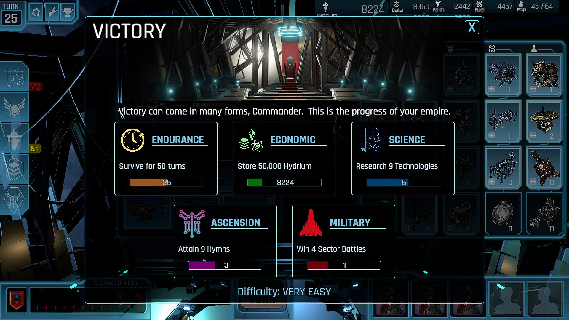 Multiple paths to victory. Will you dominate the galaxy through economy and trade, military might, or technological achievement? Or perhaps you will just try and outlast your enemies. You decide.