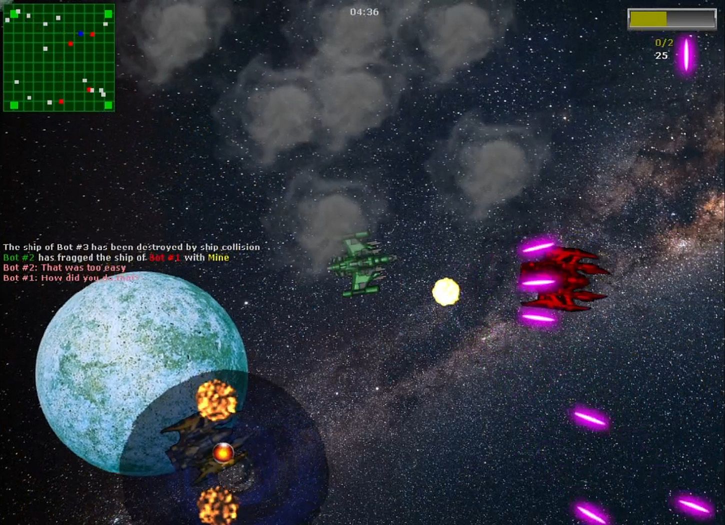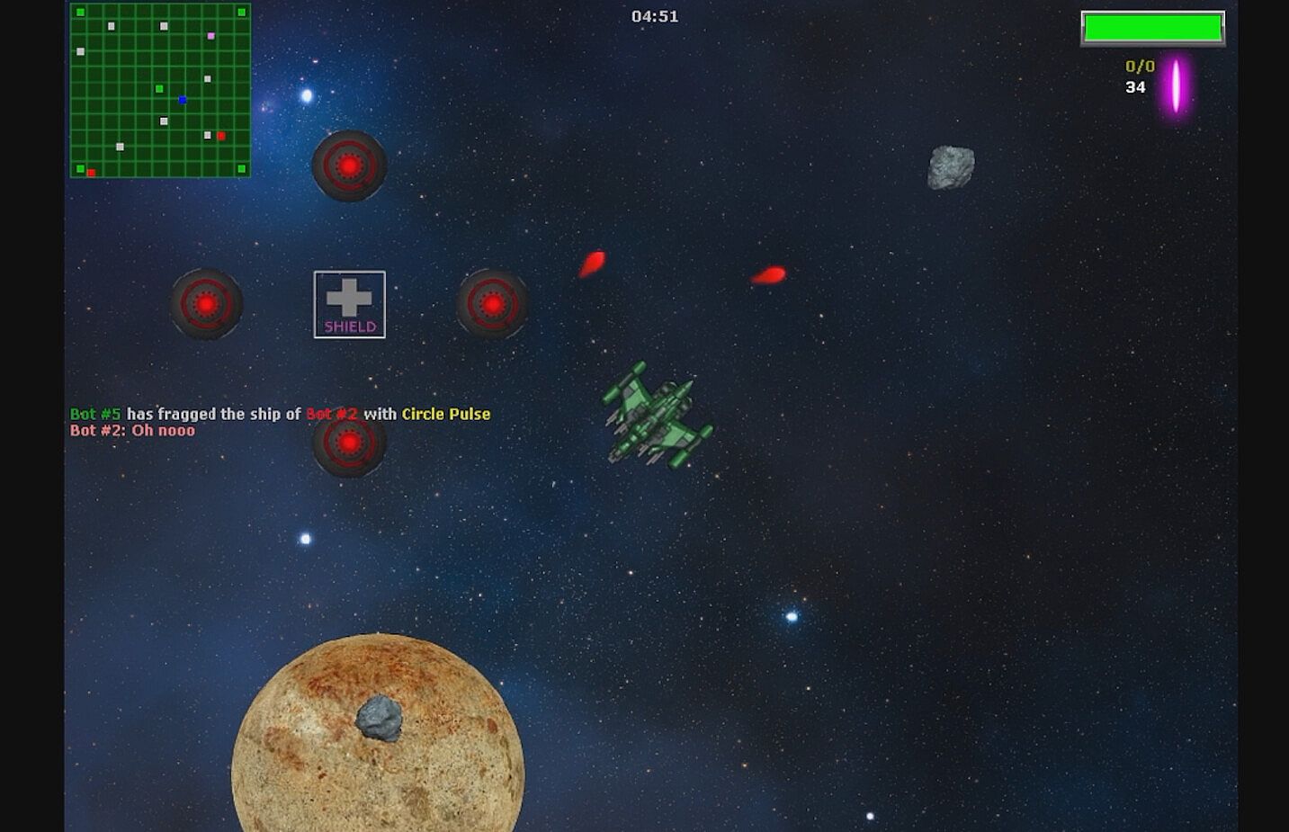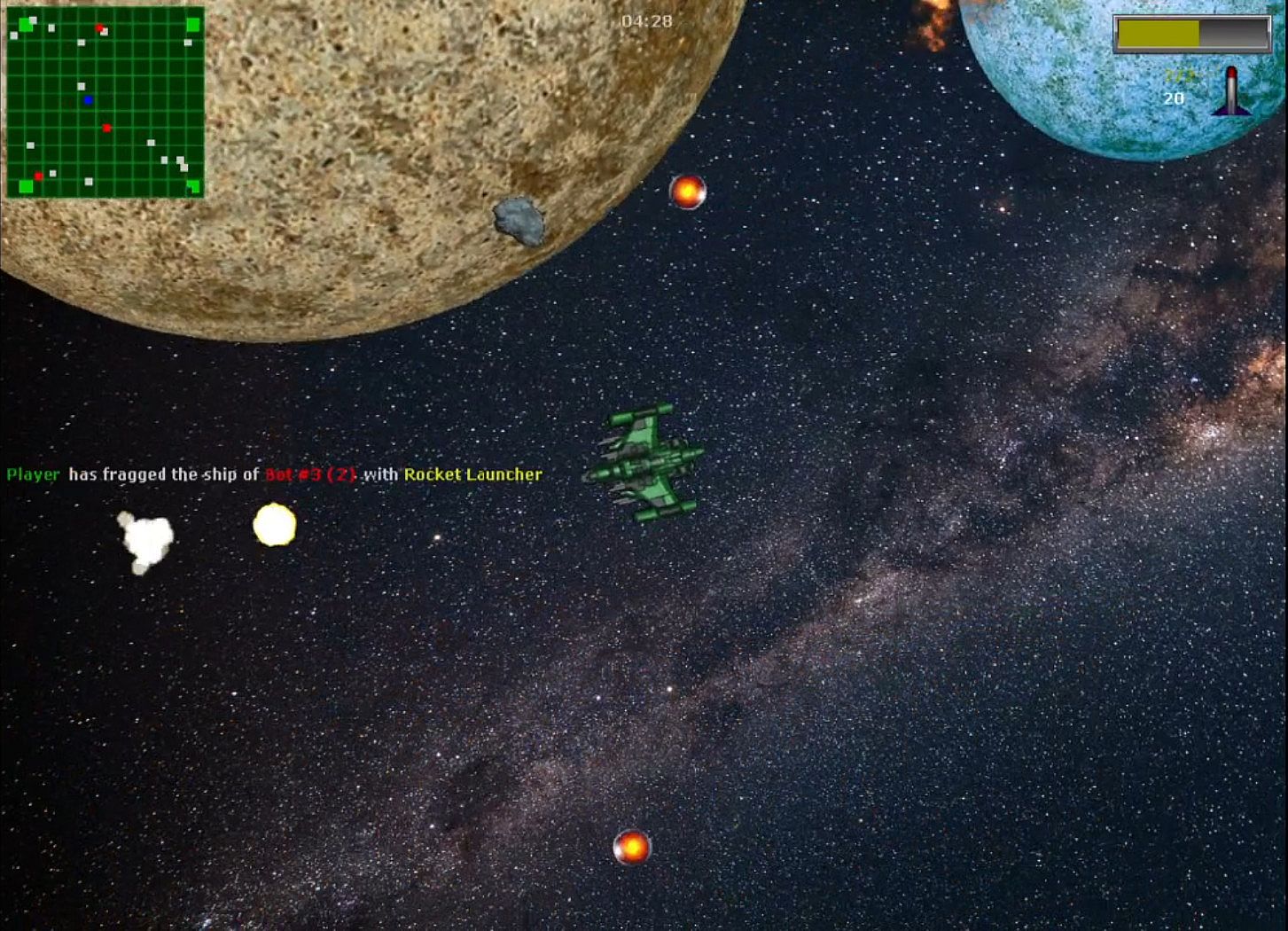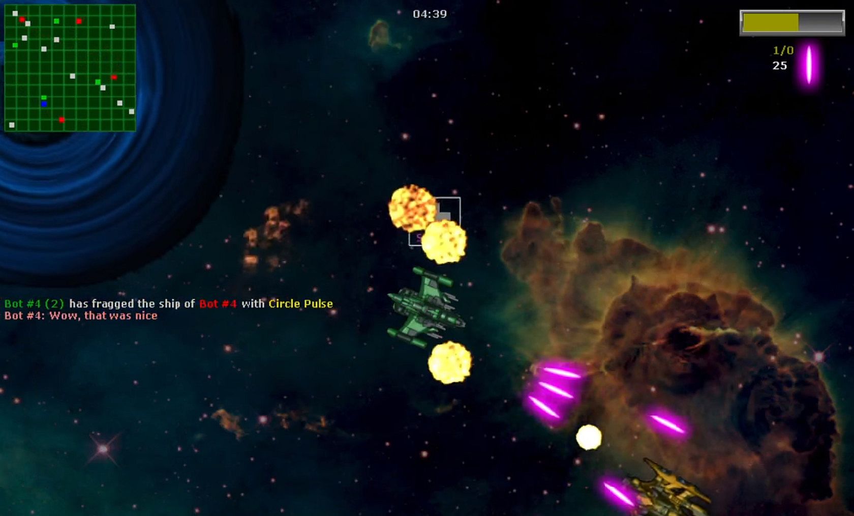 This game is especially suited for quick local matches against bots in a space setting. It's very simplistic, but yet this is exactly what provides you with much fun during casual gameplay sessions. Protip: Use the radar to see where your opponents are in order to seek and destroy them. Good luck, pilot!
