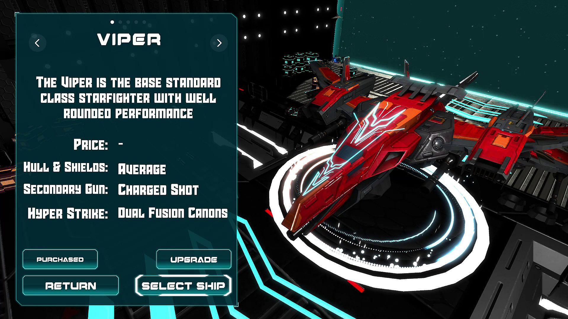 Hyper Strike is a space shooter on rails with a rogue like twist. Explore the outer space colonies, battle in scenarios, and take on bosses while unlocking upgrades and slowly gaining strength to take on bigger foes.