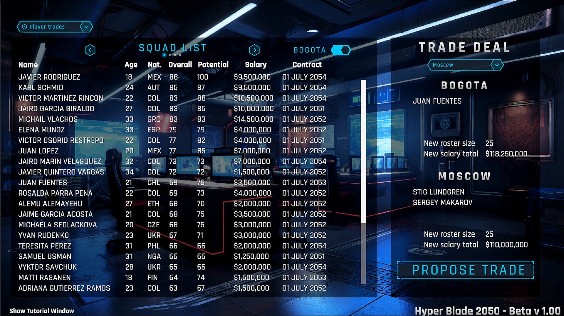 HyperBlade 2050 is a futuristic text-based sports management simulation set on a dystopian Earth. Experience the excitement of professional sports management, whilst being drawn into the rich lore of society in an alternative future of the 2050s.