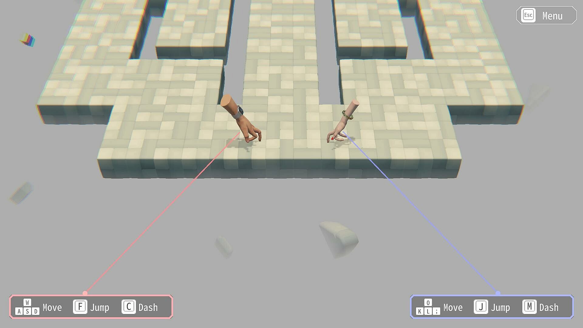 The game involves controlling two hands, one with your left hand and the other with your right hand, to reach the goal on the stage. The hands can change their movement direction, jump, and run.