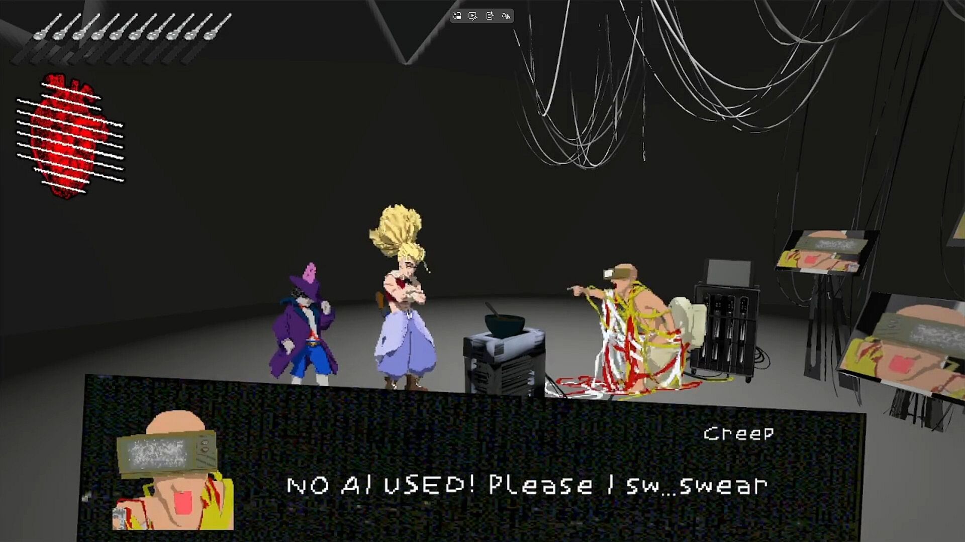 Engage in 2.5D hack-and-slash action seamlessly mixed with first-person shooting, inspired by No More Heroes and Killer7. Protect Tiro, a soft oblivious boy, from monsters and opportunistic bandits. Or don't, escort missions can be annoying. In between combat, explore the strange world and meet some colorful characters. Consume every addictive mind altering substance you can find, or maybe this is a good time to attempt sobriety. Choices matter? Find the exit. You are hysterically strong.