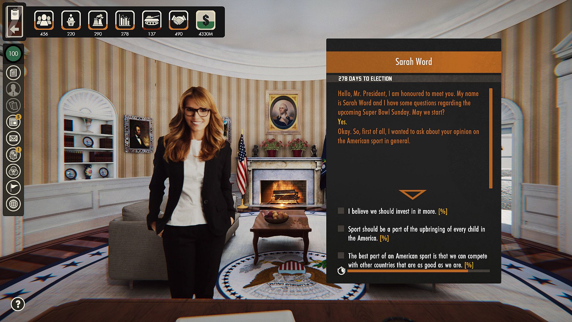 Select dialogue options that suit you best and watch them affect the statistics.