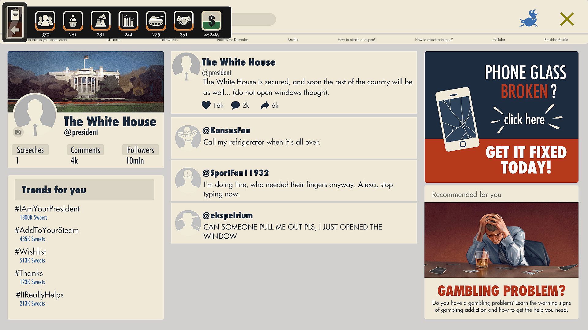 Use the most well-known social media platform - Screecher. Screech about your plans, attitude, call somebody names or maybe praise the voters. It is entirely up to you how you want to come across in the internet – as funny, empathetic, factual or maybe weird? Being the president you have a will and a power to create your own image and write schreeches to your liking. But remember - there are always going to be responses from other users. Prepare for a public backlash!