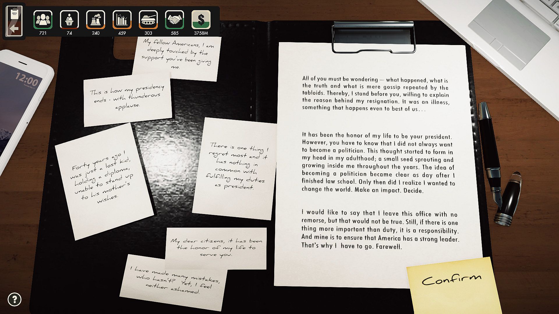 Touch people’s hearts with your writing abilities. Create the most compelling speeches and statements to achieve your goals. Want to calm the enraged voters? Show the party that you’re the most efficient president? Raise everyone’s spirit with a resignation speech? All of these can be done with a proper composition. Receive the title of the most charismatic leader ever!...