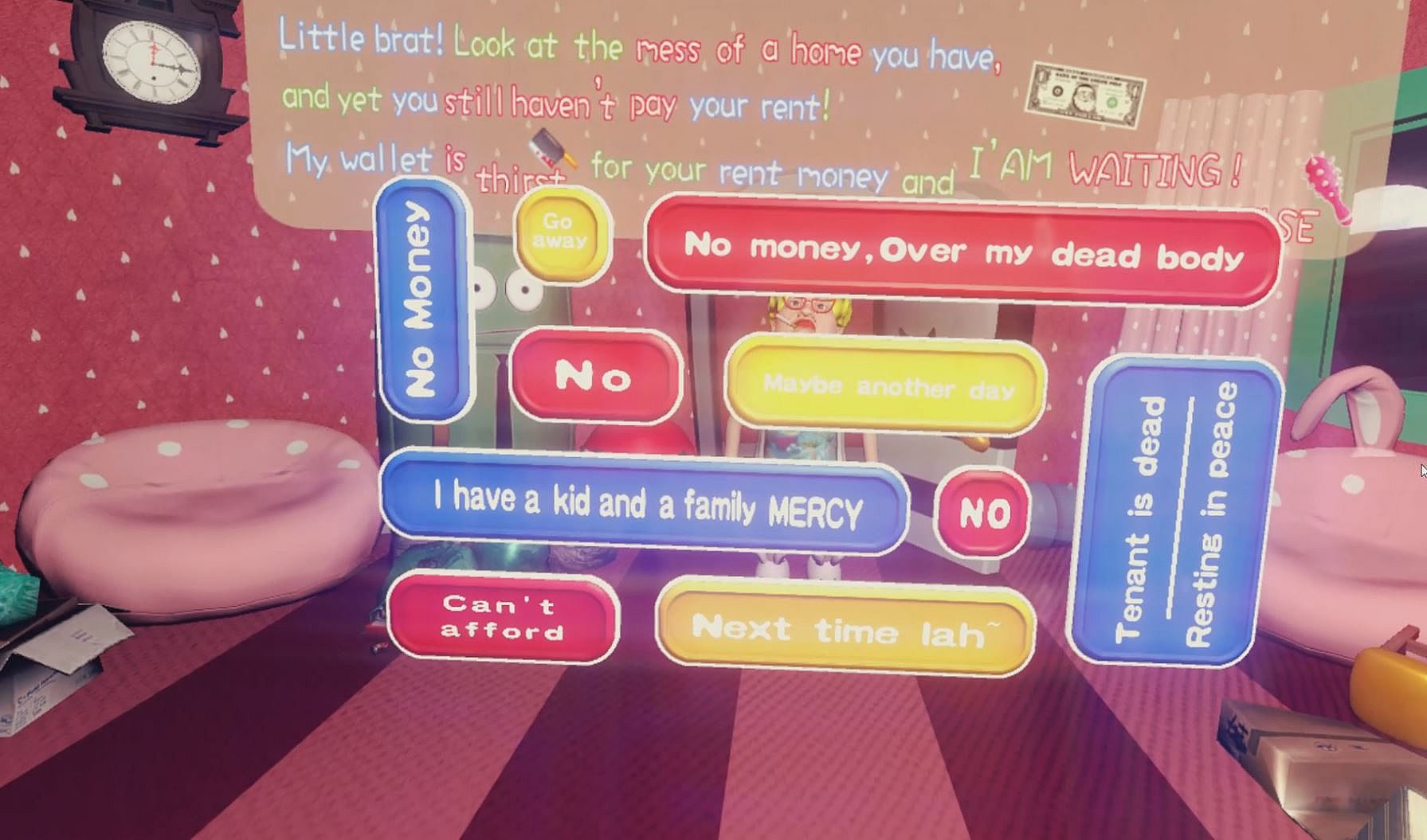 "I Pay No Rent" is a fun and relaxing game that let player role-play the tenant of a cosy apartment. You're to engage in a tug of war with your landlord on the serious issue of rent payment: Every knock on your door coupled with the disturbing grunt from your landlord is a warhorn for the beginning of another day's negotiation (warfare). This is a constant tug of war between your wallet and your landlord's wallet, so fight for your freedom (10 dollars)!