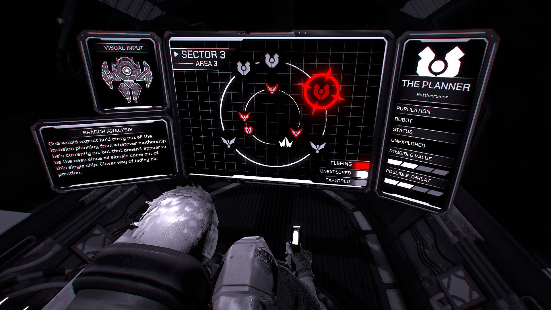 You’re an outlaw traveling through space, infinite and black, in search of the person who subjected you to such unspeakable pain. In fact, you’re so focused on your quest that you stopped paying attention to anything else, making your surroundings look muted. In return, however, your targets now appear all the clearer to you, constantly glowing in RED.