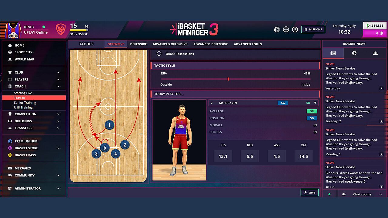 Define every tactical detail: from defensive intensity to offensive strategy, player rotation, and game pace management. Do you prefer an explosive, vertical style or a methodical, possession-based approach? Every decision impacts the game. Show off your coaching vision.