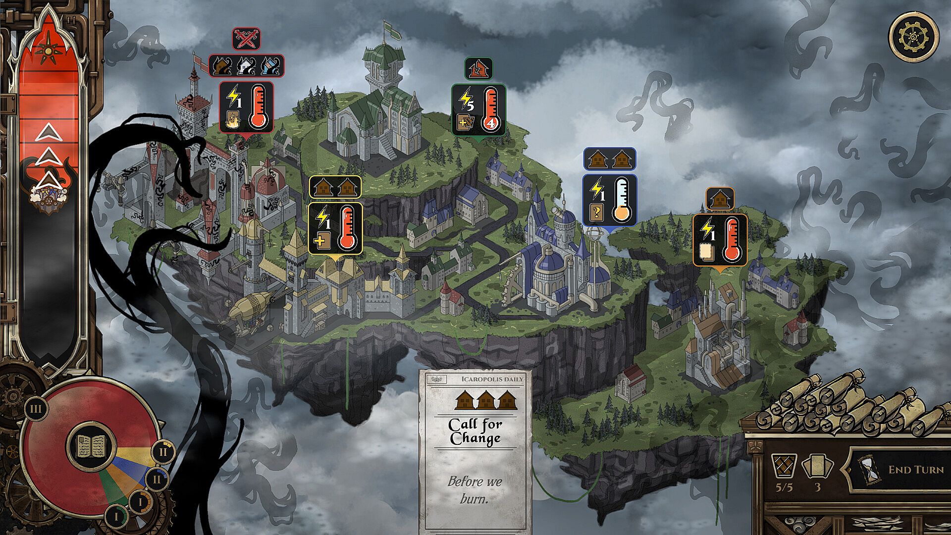 Act swiftly. The Growth plagues your city, forcing you to fly ever higher. Will you, amidst the political turmoil and the looming threat from below, guide your people to safety? Will you find for Icaropolis, home again?