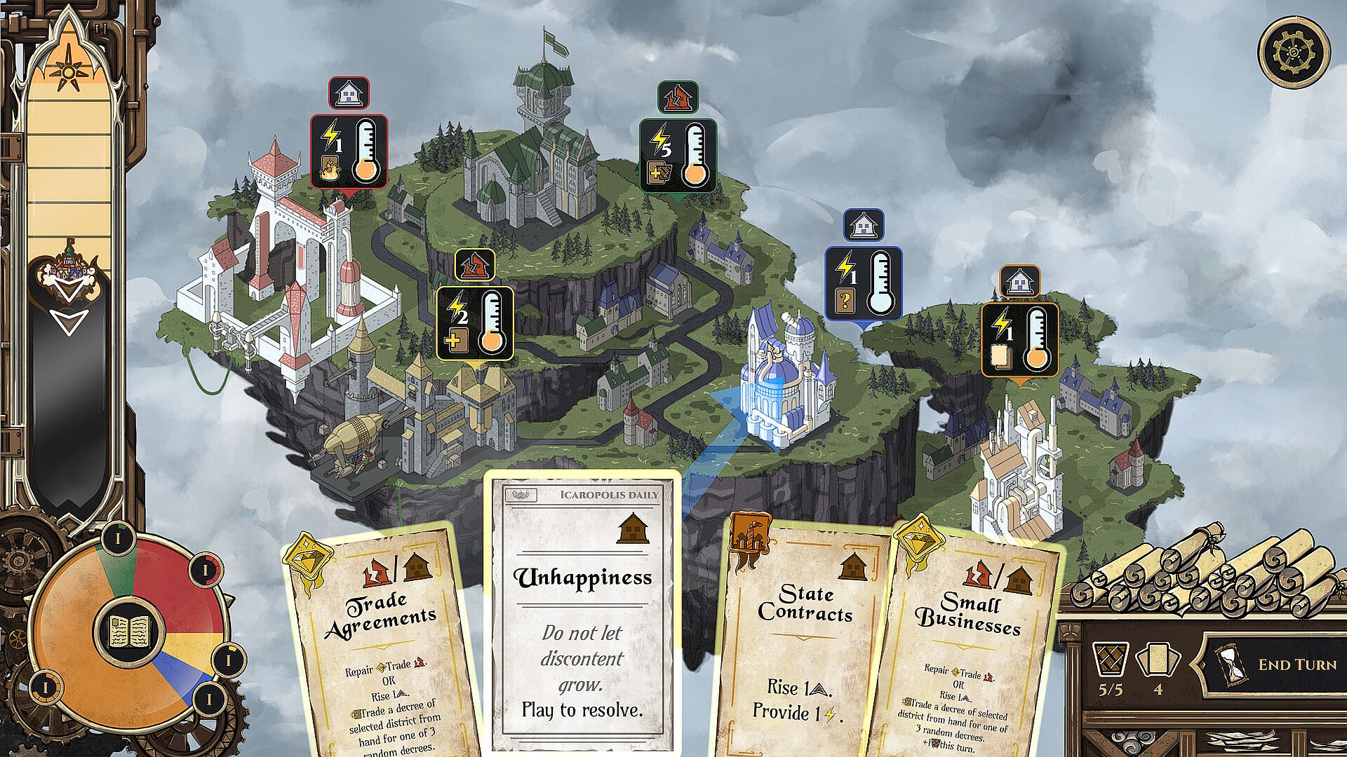 Icaropolis is a card-based, turn-based city builder game, where unlike more traditional city builders, the player does not have absolute control.