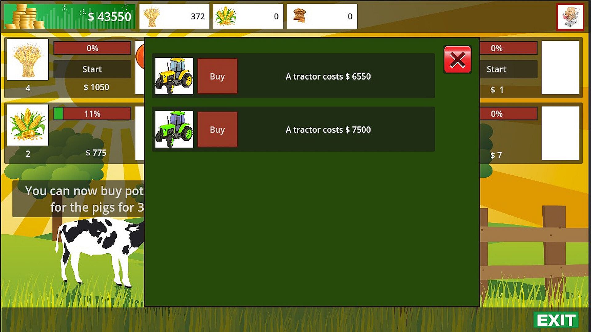 In Idle Farm Tycoon, you start with a small plot of land and a few basic crops. As you progress, you can plant different types of crops, such as wheat, corn, and vegetables, and sell them for profit. The income you generate can be invested in upgrades to your farm, such as better equipment, more land, and hiring workers to automatically complete tasks for you.