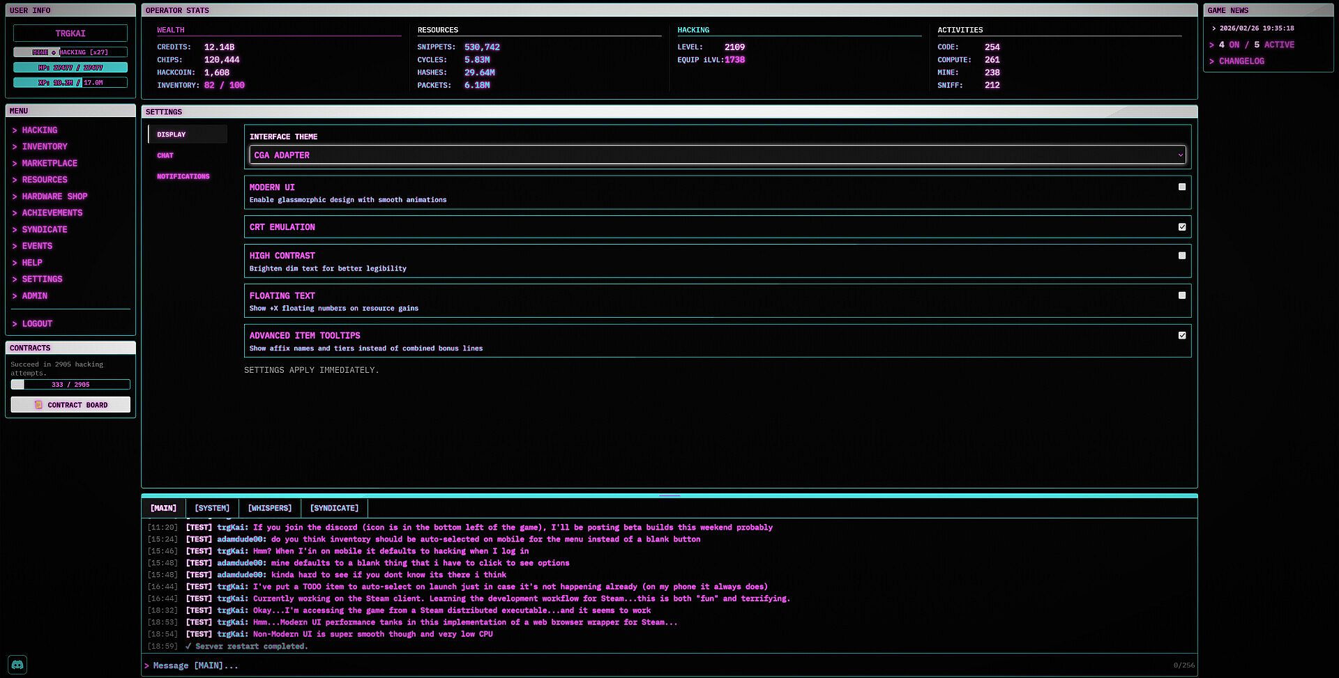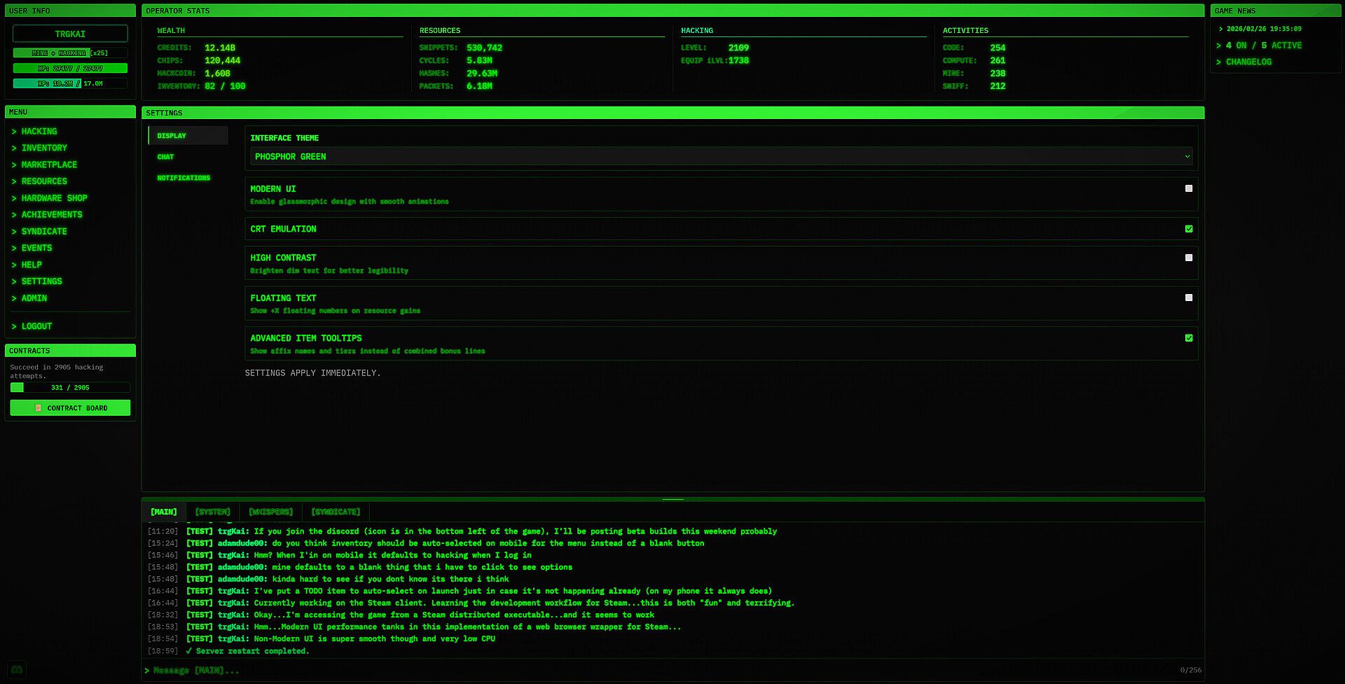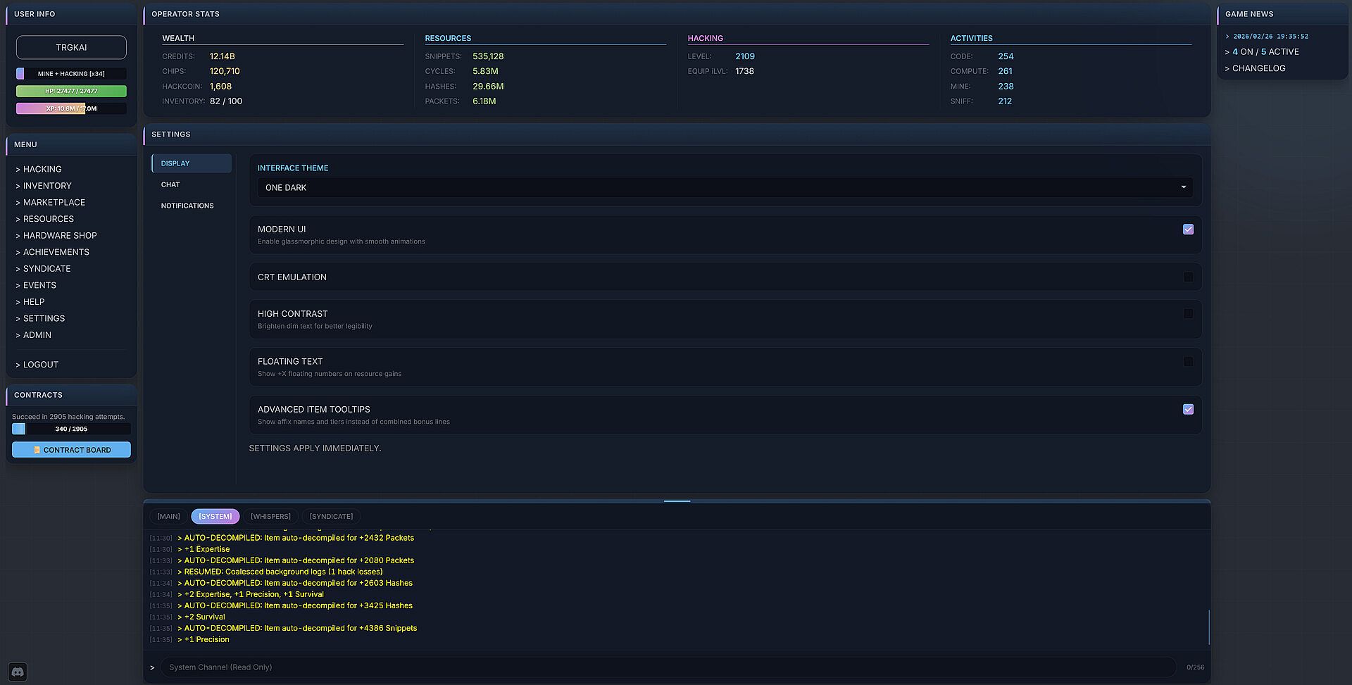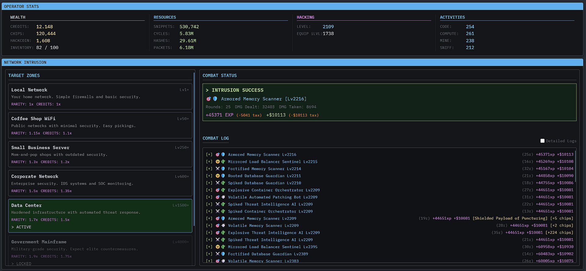 Upgrade your hacking prowess in this unique "Inaction" RPG/MMORPG.  Optimize your build by engaging with the dozens of stats and over 100 different affixes that can appear on gear.  Try to find the ultimate "Signature Affix" item providing unique gameplay mechanics and enabling builds that utilize unorthodox stat combinations.