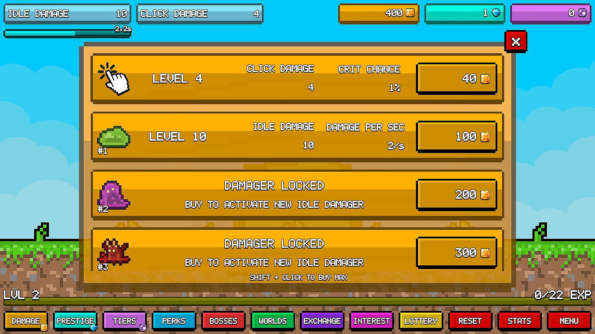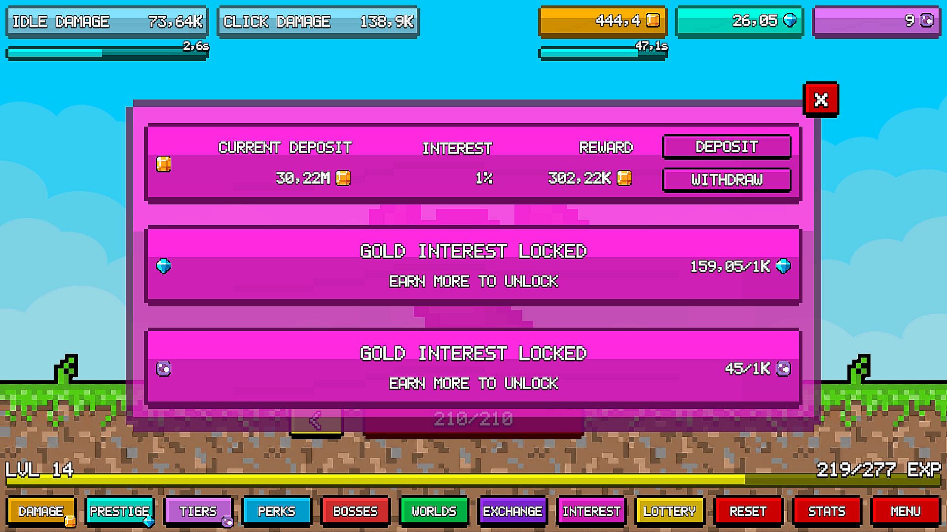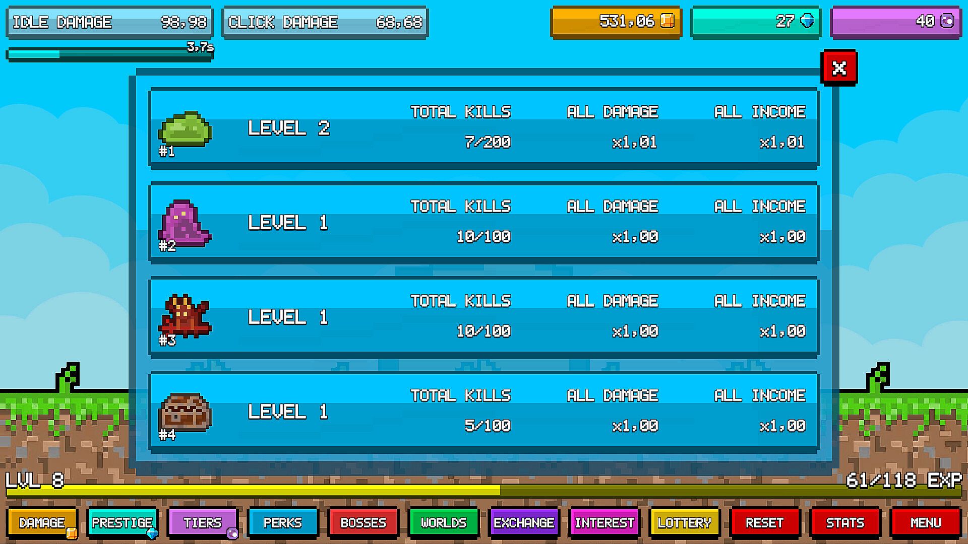 Idle Pixels is a complex idle clicker game with almost infinite possibilities. Slay pixel monsters to earn money and experience. Level up, gain prestige points, and unlock powerful abilities. Fight bosses, conquer various worlds, and use every opportunity to become stronger!