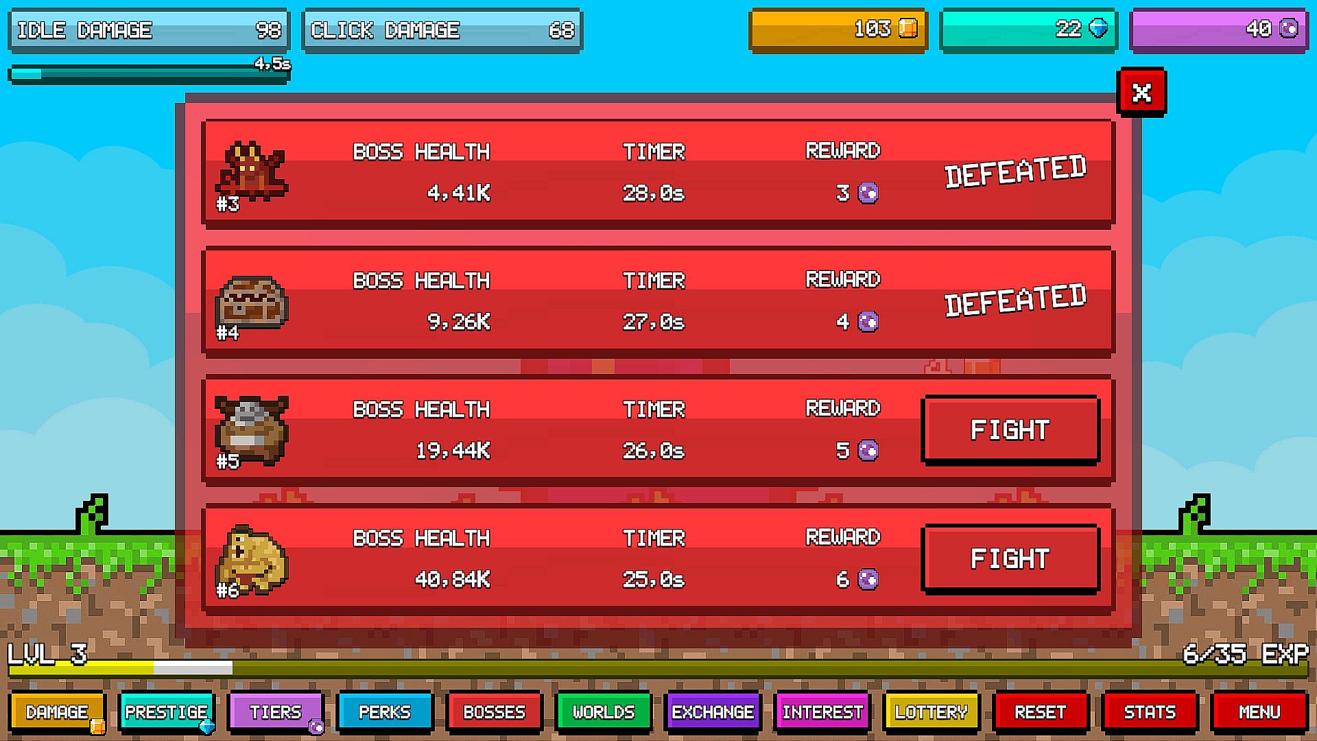 Battle against hundreds of different pixel enemies. Each one has a super-powerful boss version that must be defeated to complete the world.