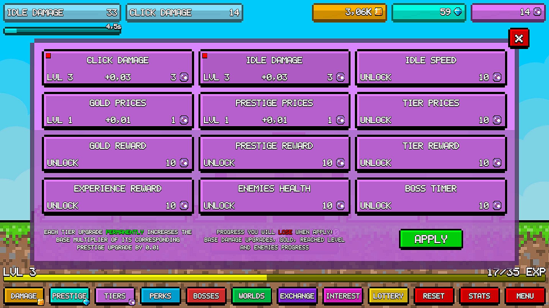 Invest in powerful prestige upgrades, which can also be permanently enhanced using tiers. Each upgrade requires a reset of your game progress, but it's a fair price for the bonuses you receive!