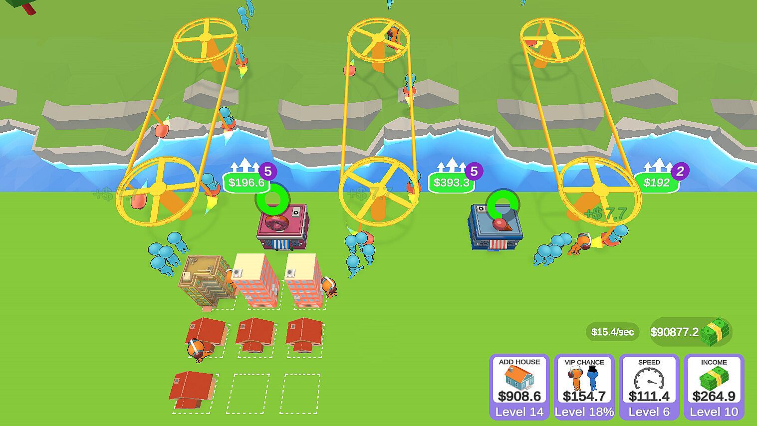 Build platforms to move people around and grow your transport operation. Buy houses, merge them to create larger versions, and boost your customer numbers. Add a VIP section to draw in high-paying customers who increase your earnings.