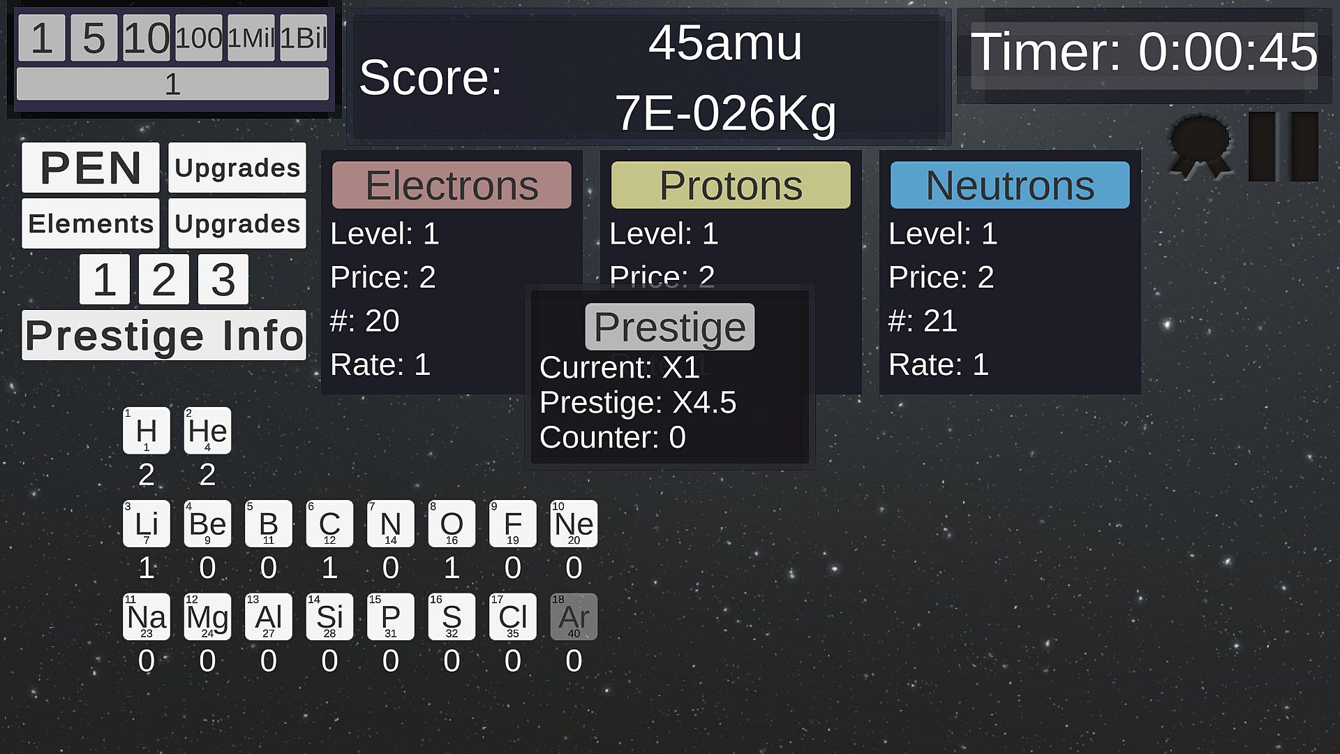 You will start off with just 1 Electron, 1 Proton and 1 Neutron. From there you must increase your rate of production of these Sub-Atomic Particles.