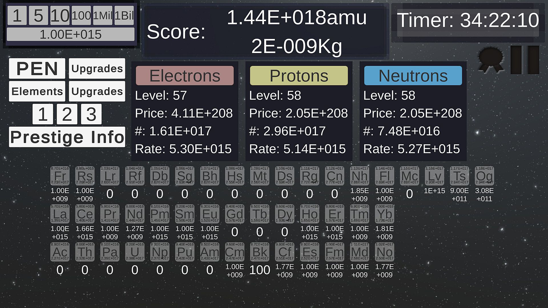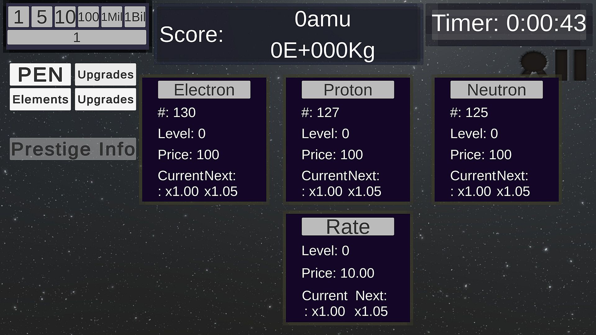 However, this may seem a bit slow after a while, so Prestiging will give you an opportunity to reset and start over. This time though, you will have a multiplier for your Rate of production for your Sub-Atomic Particles. This will massively speed up your progress.
