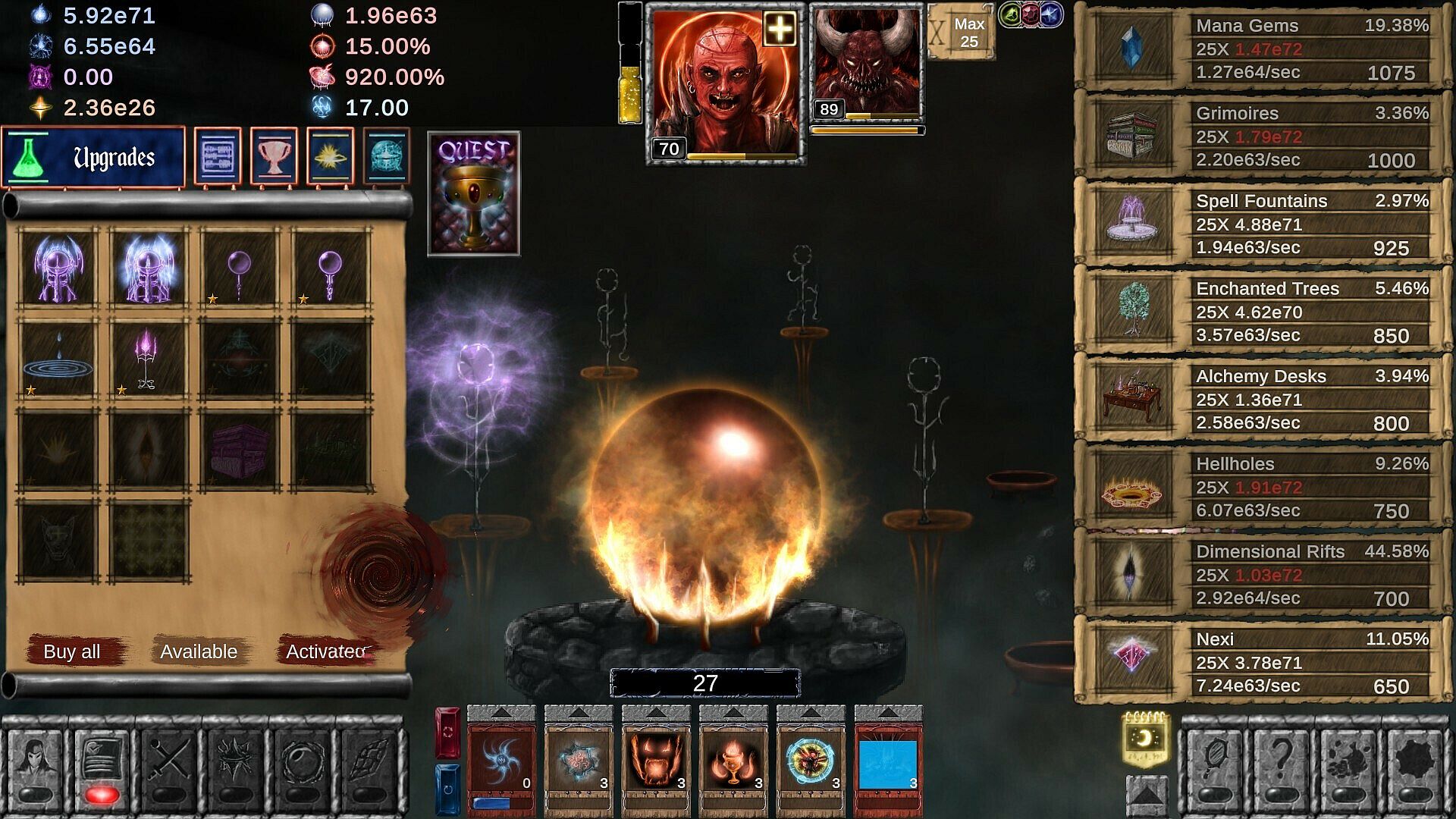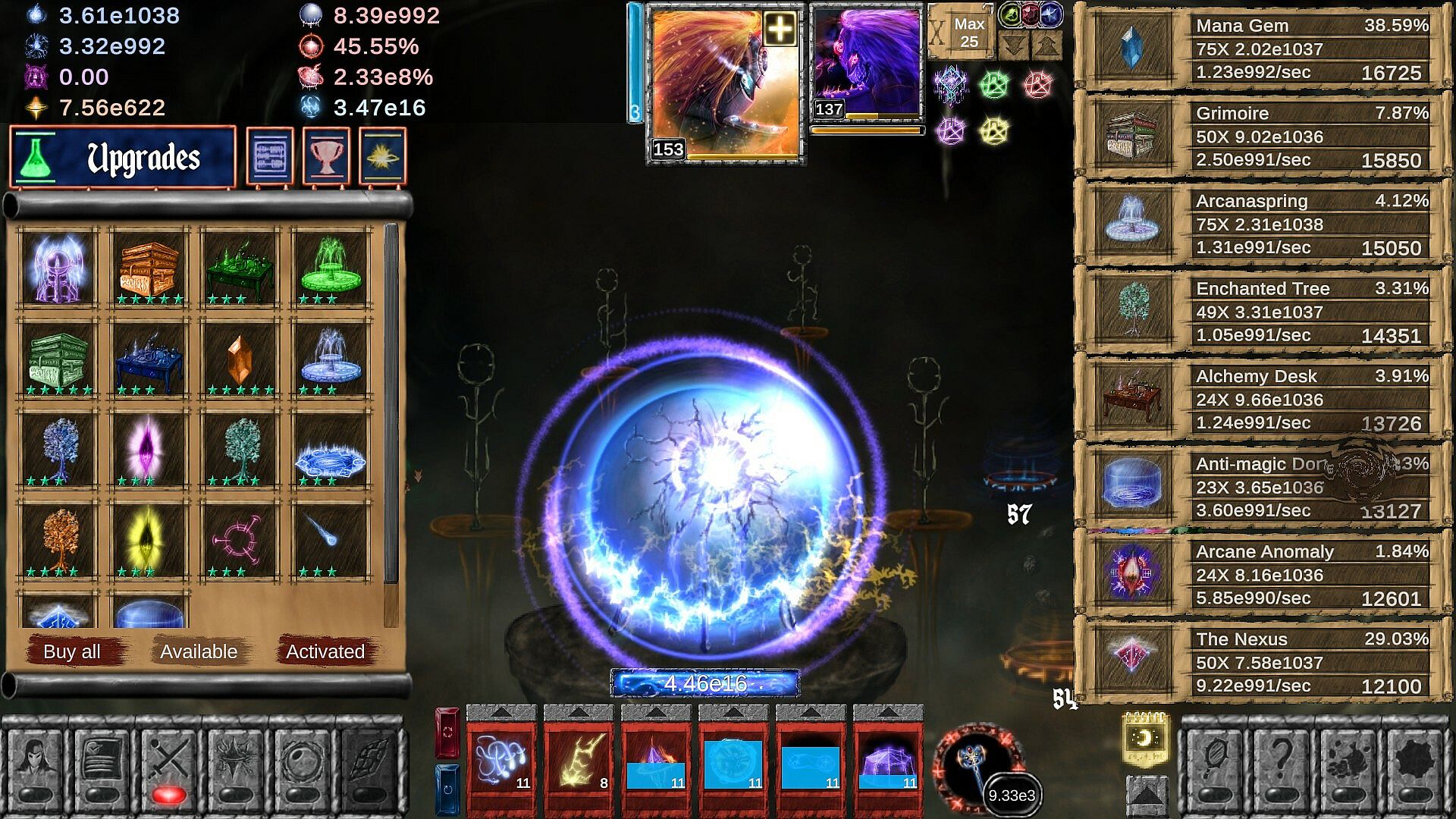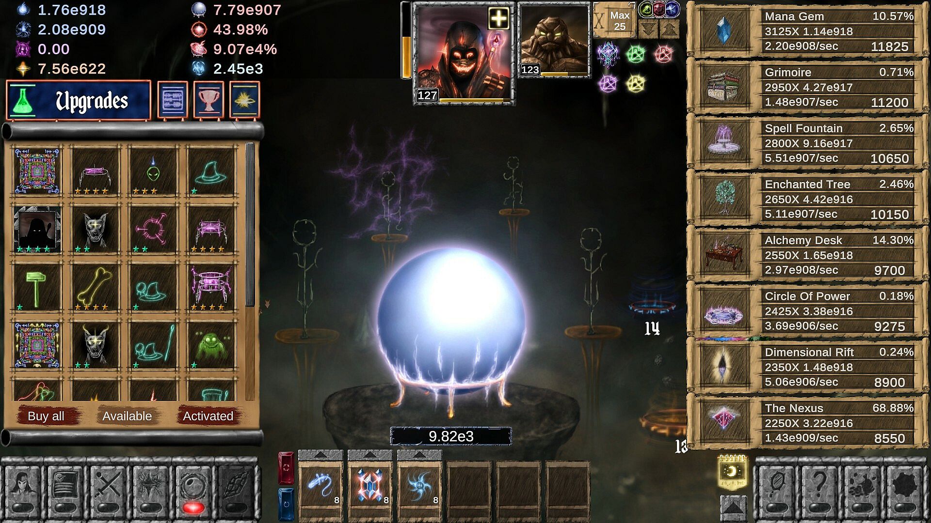 The core aspect of Idle Wizard is choosing a Character Class. You start as an Apprentice, and are able to choose various Classes (12 total, with 6 powerful Hybrid classes later in the game), from classic fantasy-inspired sorcerers to more unique magic-wielders. Classes use different mechanics to gain profit, are equipped with unique spells and items tailored for their use. While they're not unlocked all at once, all have use and range in power depending on your current progress and do not follow the simple logic of "the later it is unlocked - the more powerful it is now".