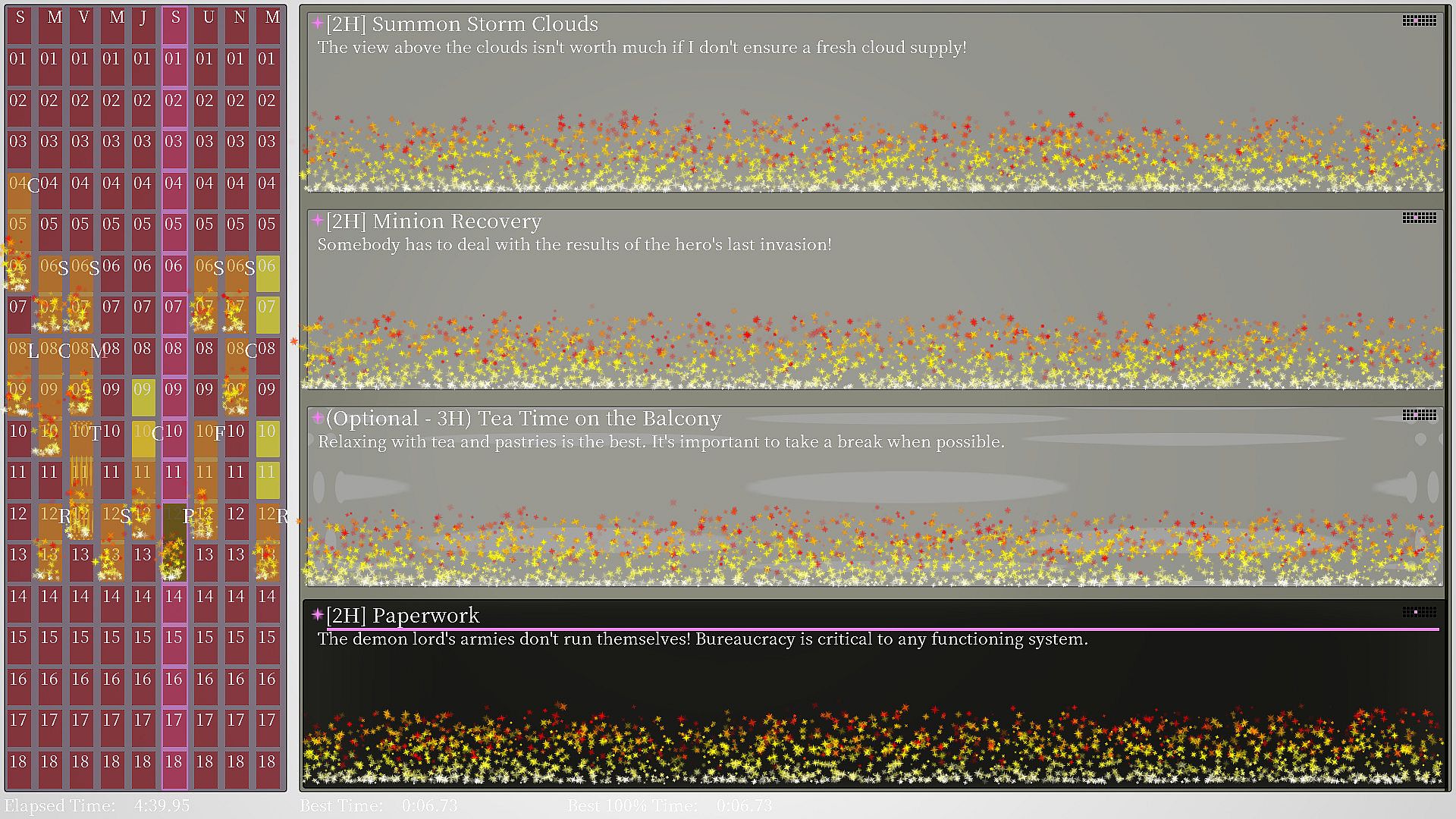 If It’s for My Client, I’d Even Schedule a Demon Lord is a calendar-themed puzzle game where you set schedules while laughing at a parodical fantasy story. Prepare a schedule, one event at a time, to make your clients happy. Resolve schedule conflicts, explore unique worlds, and challenge this time management brain-teaser!