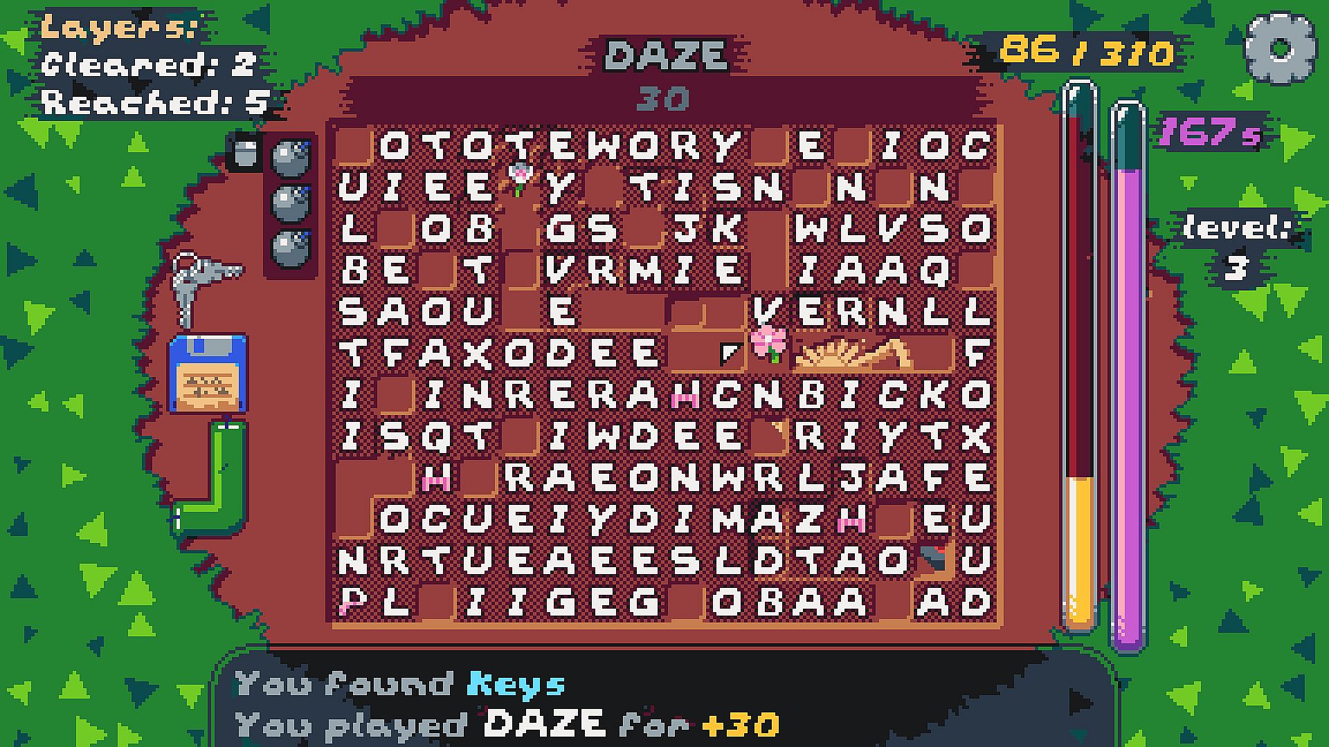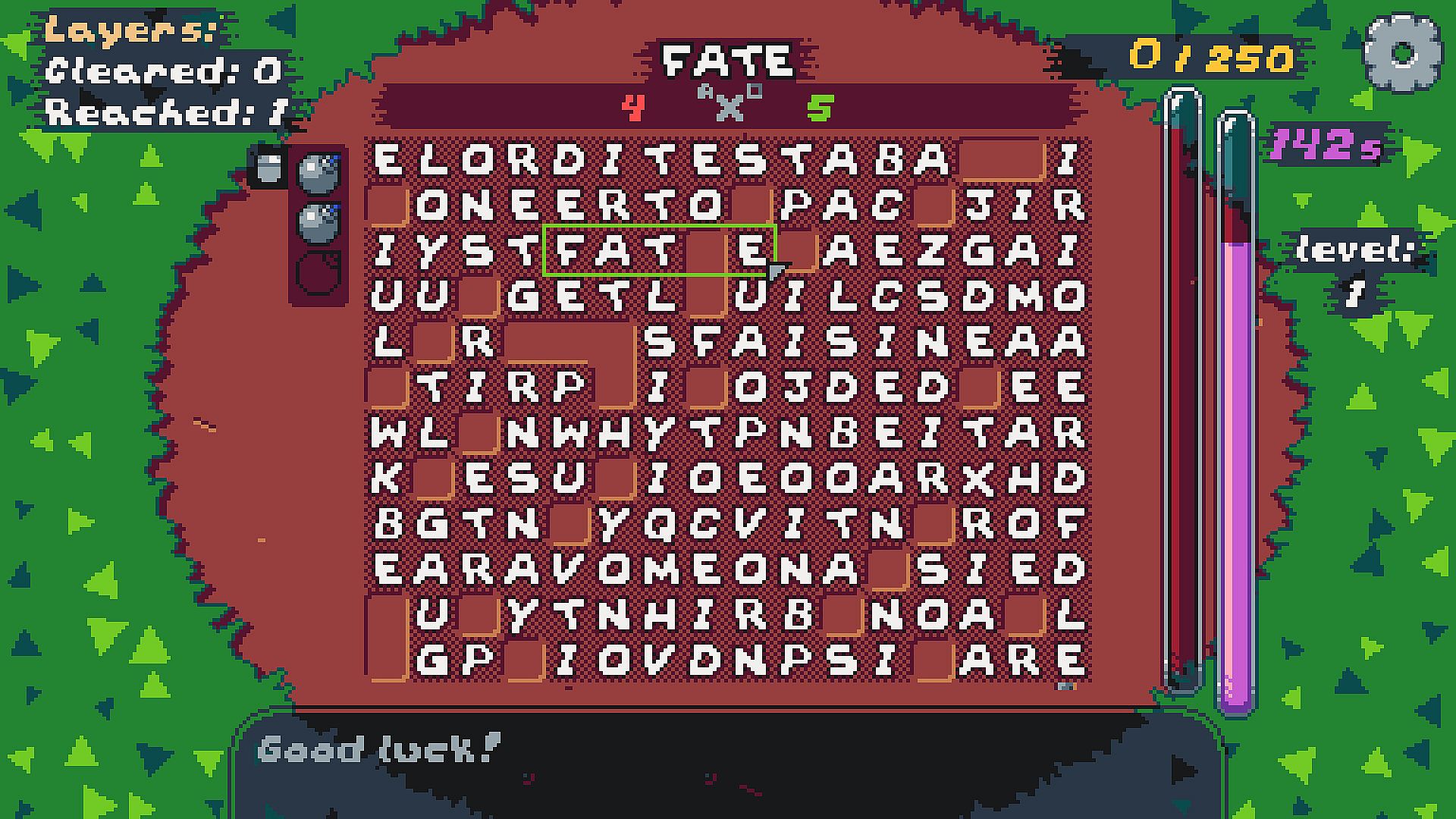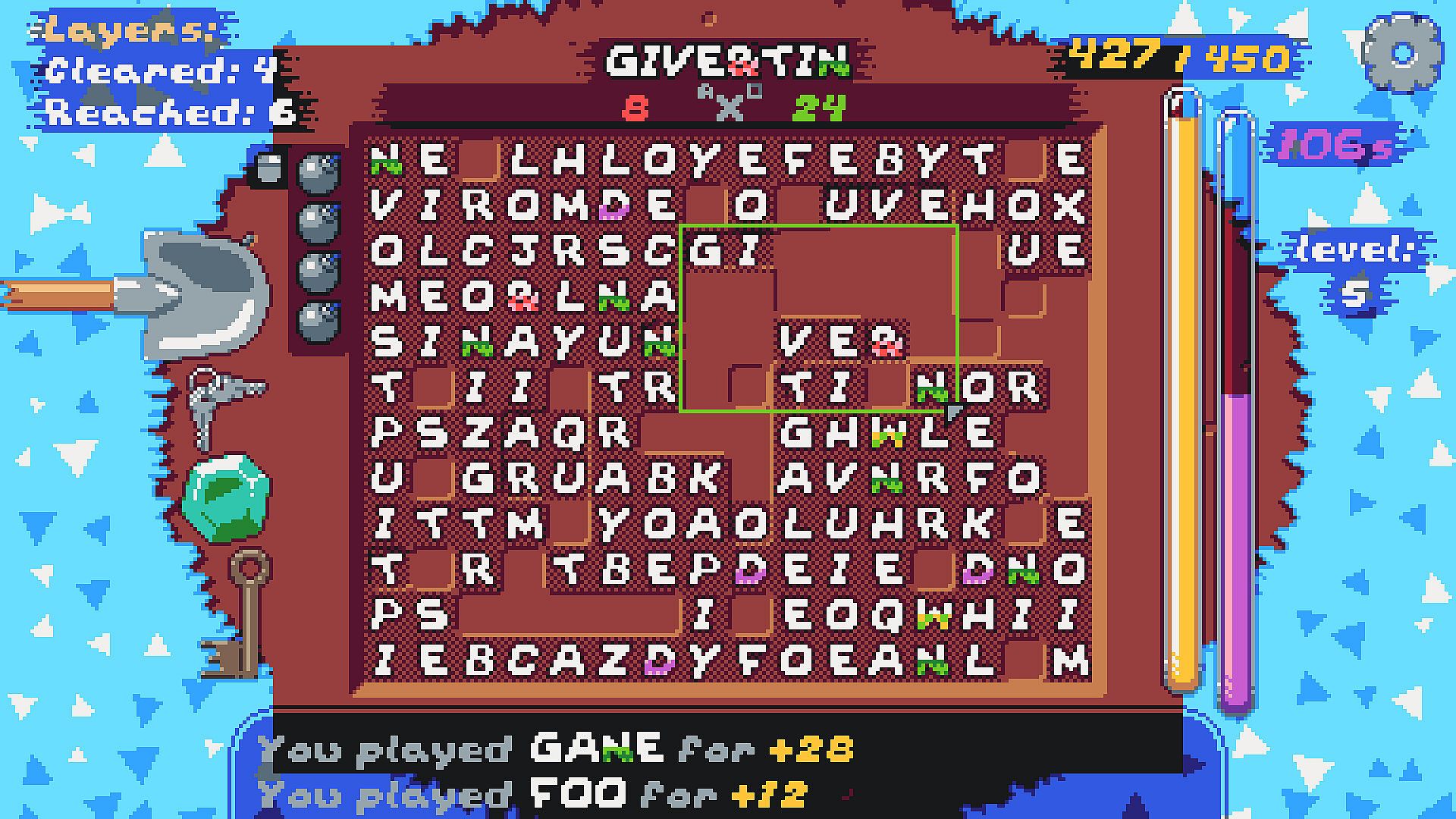 If you manage to complete the level, you will be presented with 3 pairs of pants for 3 different letters. Pants give unique bonuses to letters, a letter can be worth more, or maybe it multiplies the whole word’s value, or maybe it gives you bombs or does other things!