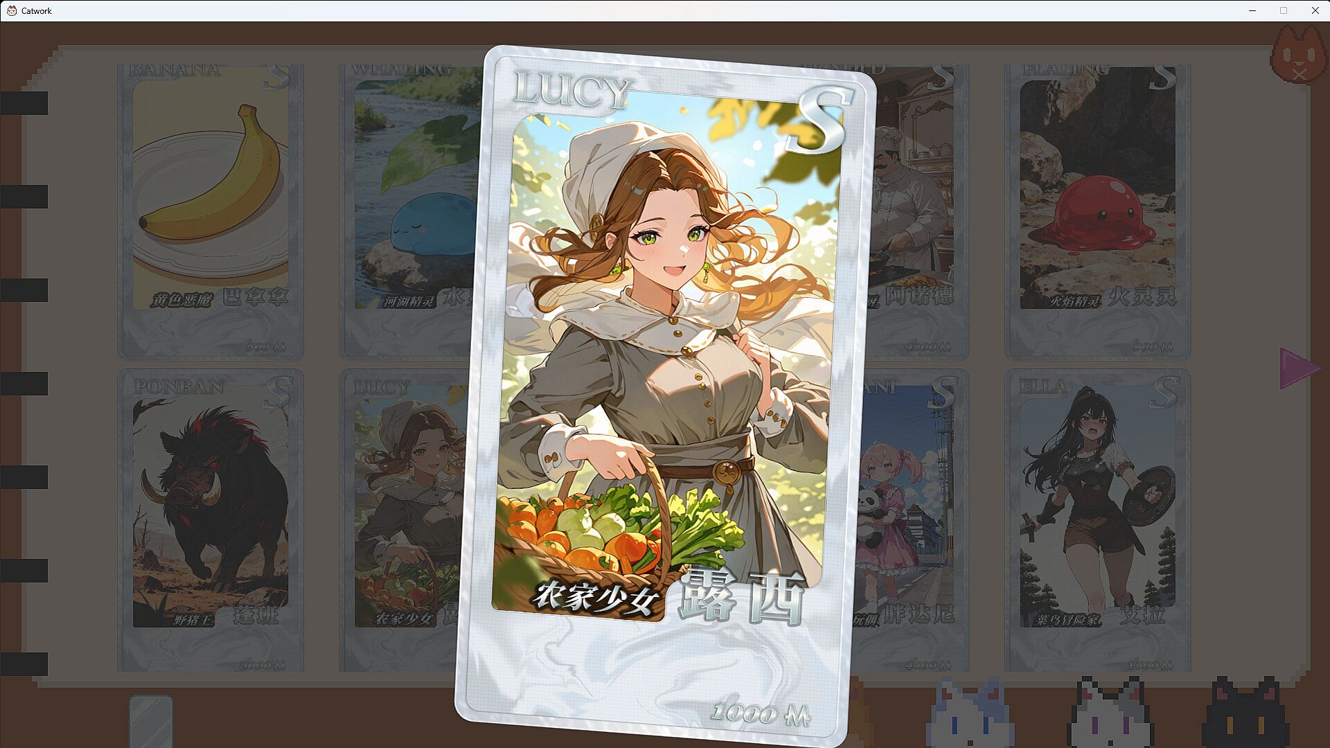 Your cat has four attributes: energy, power, intelligence, and charm. Jobs have attribute requirements and will consume energy. You can buy items in the shop to restore energy and boost attributes. Enhancing your cat's abilities allows it to take on higher-paying jobs and earn more money to collect all the cards.