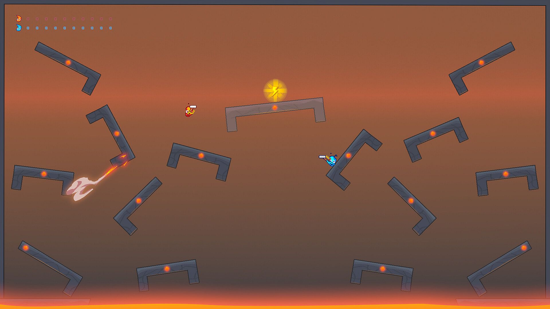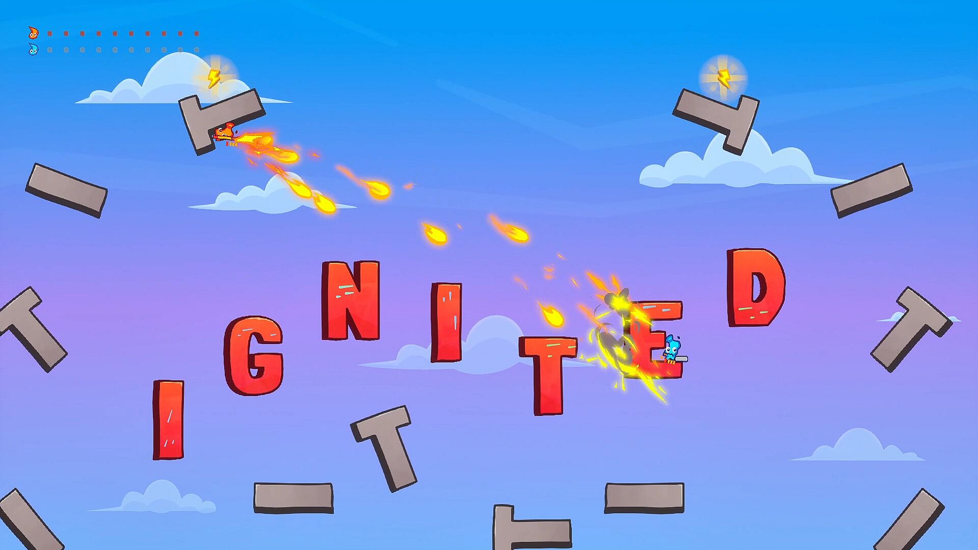 "Ignited" is a game where you take control of a little fireball creature that can only move by swinging around a hammer and pushing off platforms. Movement is key in this game as you try to be the first one to pick up abilities, capture objectives and dodge incoming attacks.