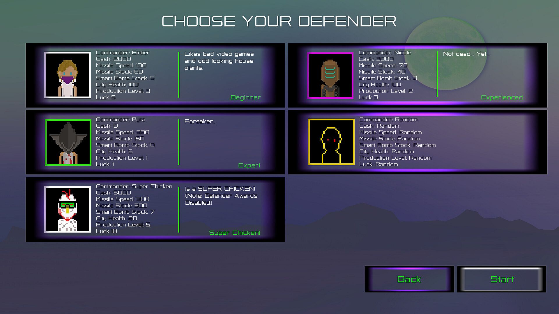 Choose from five unique defenders, including a quirky super chicken, each with distinct stats that add a unique twist to your defense strategy. As enemies descend, you’ll need quick reflexes and strategic planning to purchase essential upgrades. Increase your missile stock, boost missile speed, and enhance city health while managing your resources wisely.