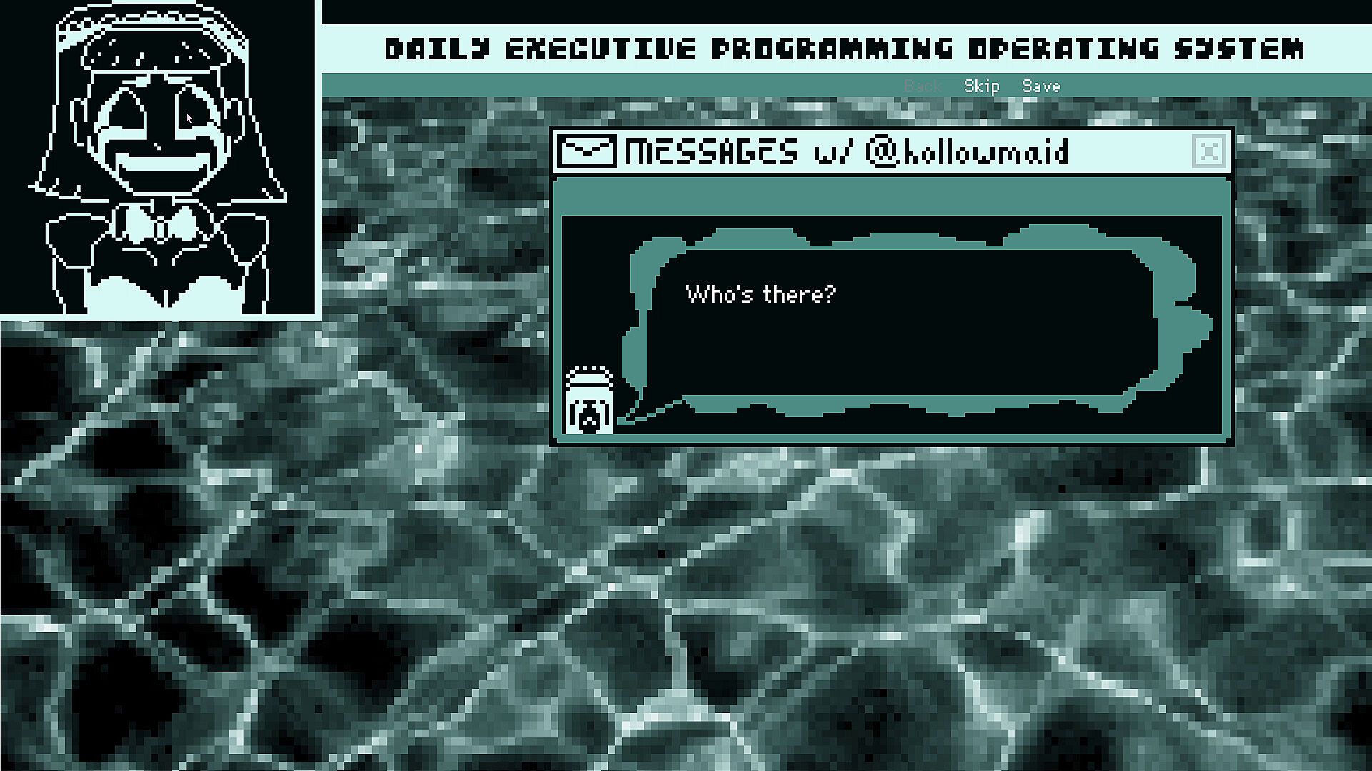 The hollow maid still lives in the Daily Executive Programming Operating System. This time, when you log on, she's nowhere to be found and the UI is completely different. "im not supposed to be here: or anywhere" is the sequel to poetic horror point and click simulation game, "im not supposed to be here."