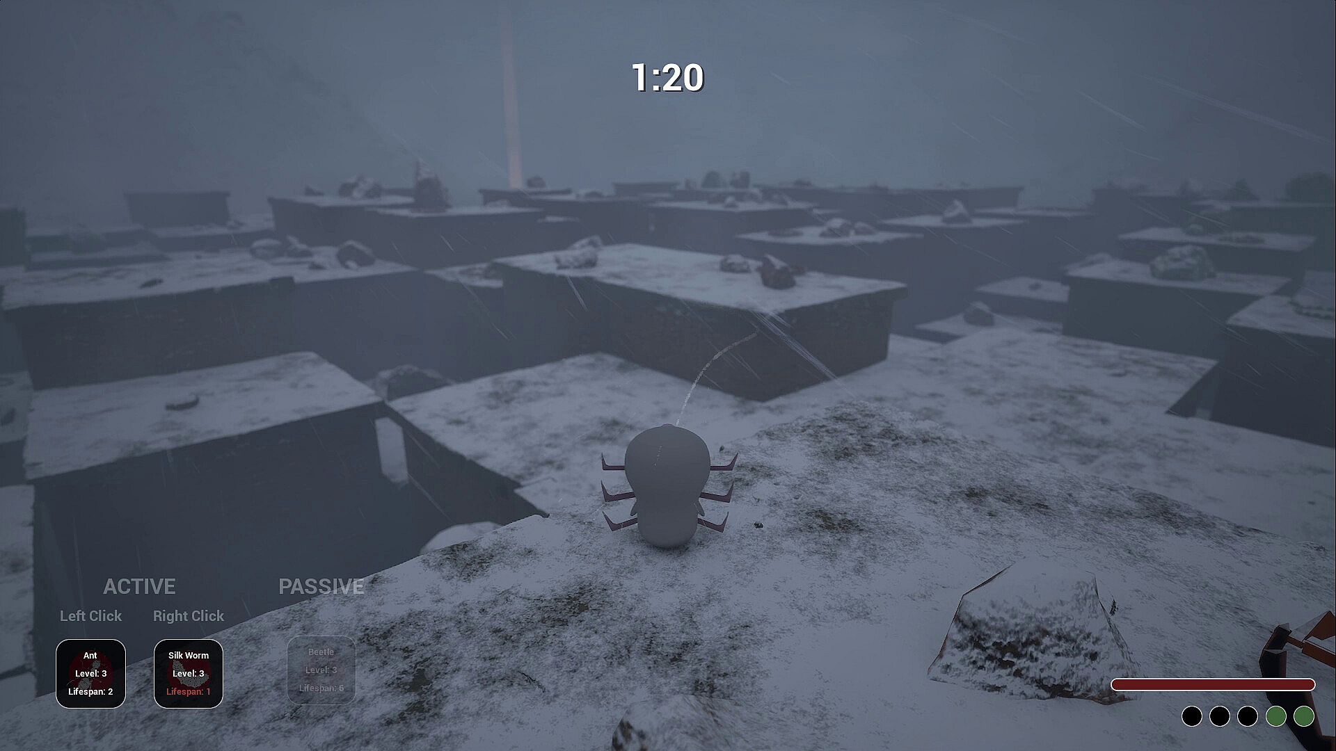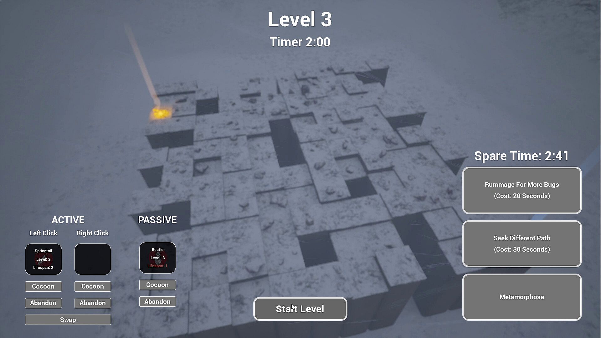 Gain enough time to start metamorphosis and reach the imago stage. The procedural levels grow more treacherous. Survey your path, plan ahead, and foster your bugs so you can survive the terrain and escape the blizzard. Time is precious. Spend it wisely.
