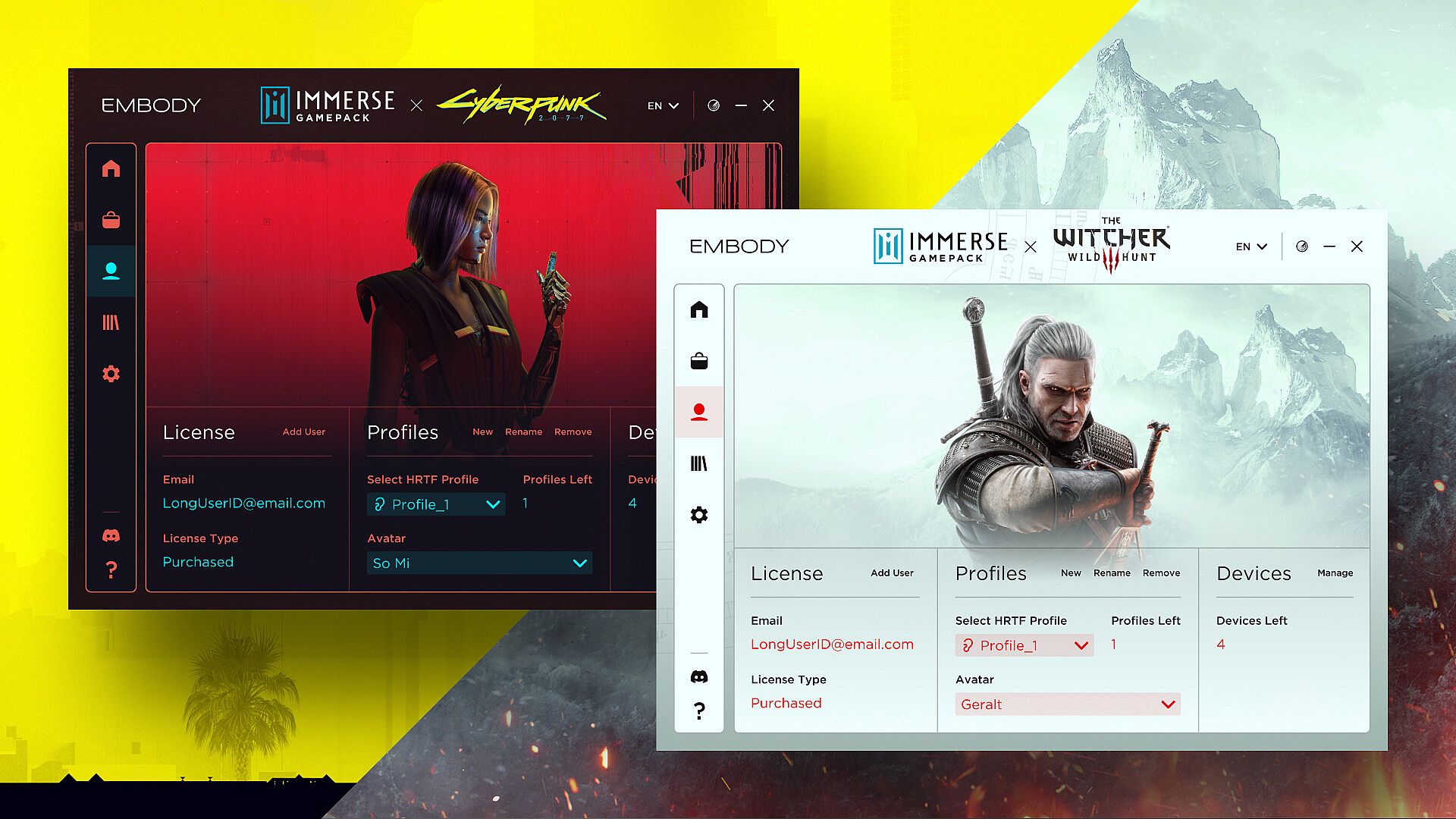 Immerse Gamepack offers AI-powered Personalized Spatial Audio, headtracking, and custom EQ for 100+ headphones to deliver ultra-immersive sound in Cyberpunk 2077 and The Witcher 3: Wild Hunt. Hear the game world exactly as you were meant to!