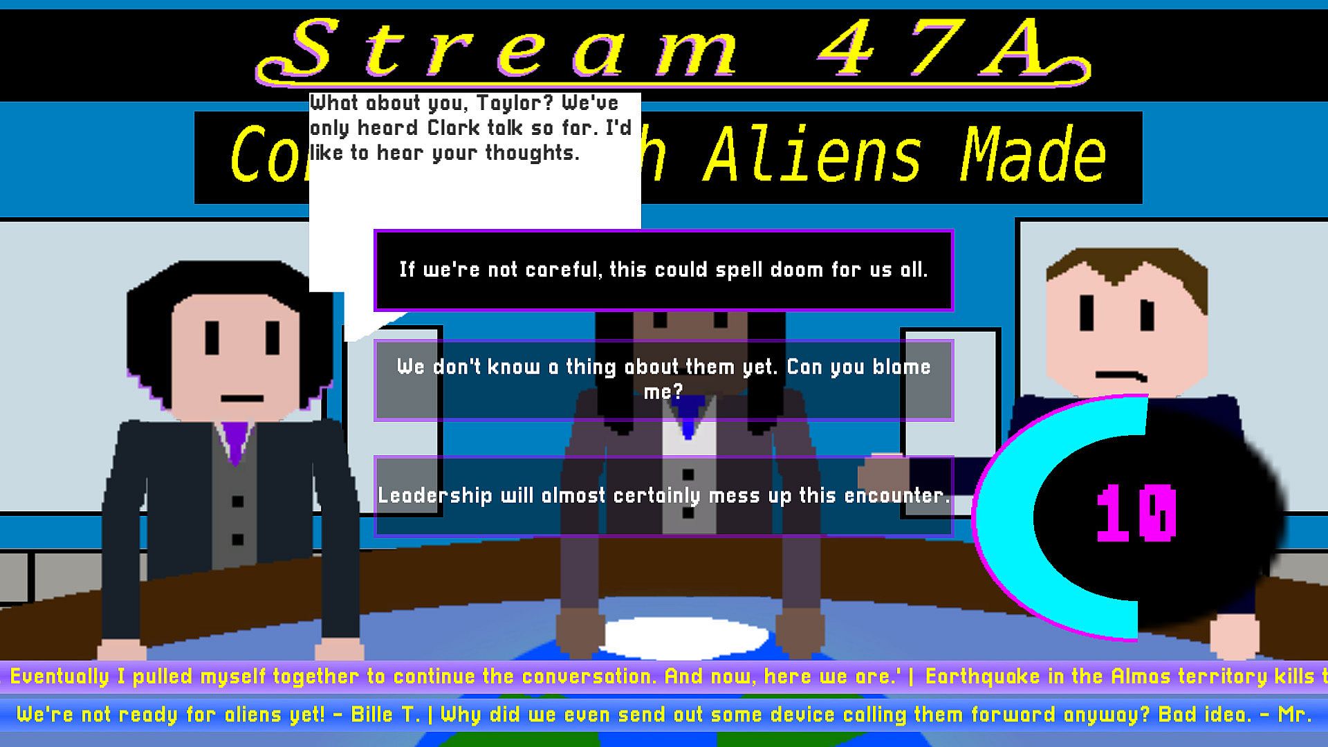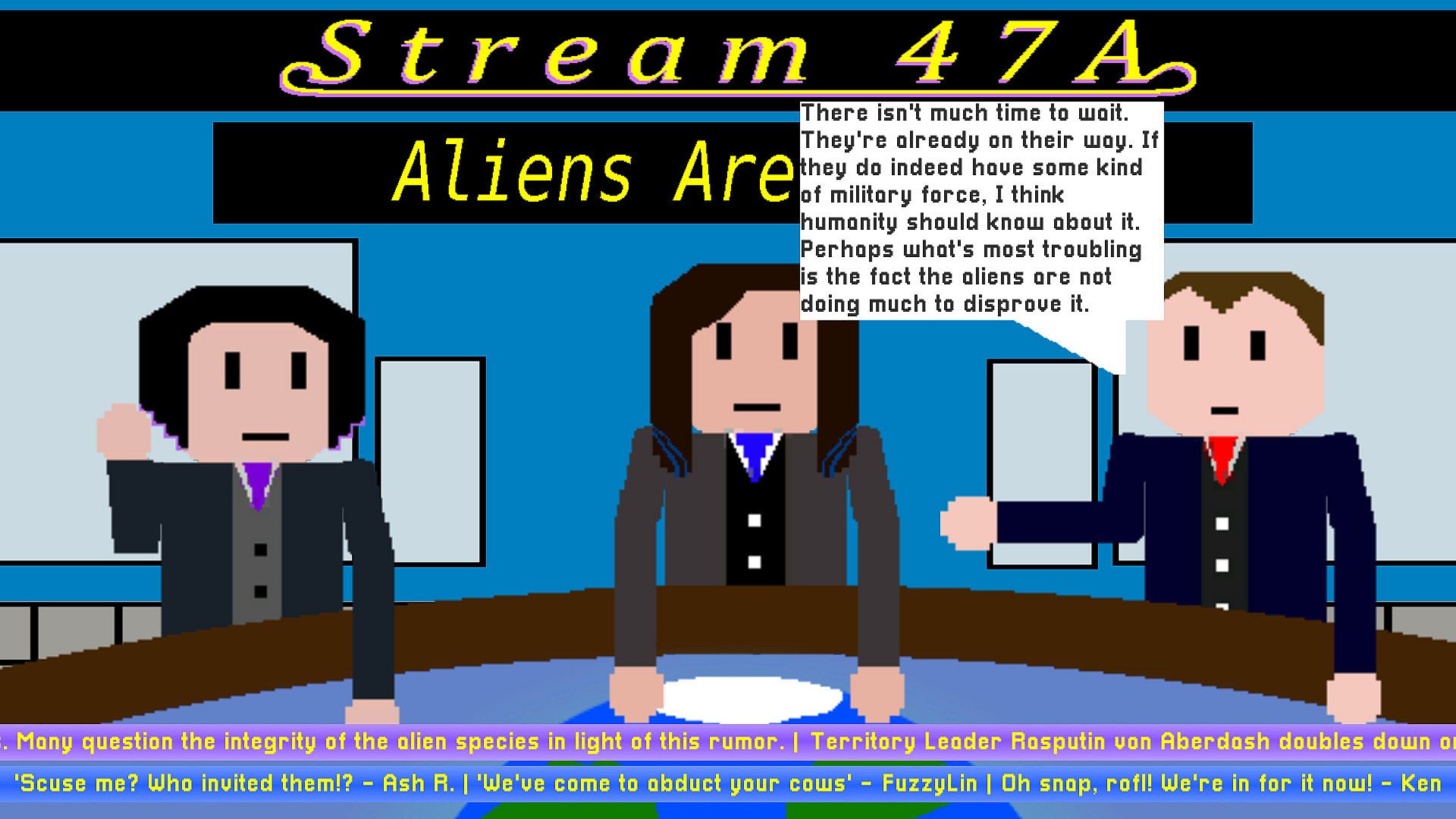 Become a news pundit for the popular news stream show, STREAM 47A. You and two others, Clark and Patricia, are tasked with commenting on the latest news story that's shaken the entire planet to its core. Aliens exist, and thus we are not the only intelligent life in the universe. One thinks this marks a new age for humanity, and the other believes this is the beginning of the end. But how do you take this revelation? Are you happy? Scared? Something in between? The whole world is watching you and hanging on to every word you say. The people's perception of the newly discovered aliens will be shaped by your opinions. Not only that, but the aliens themselves will almost certainly hear what you have to say. What kind of first impression do you want to leave?