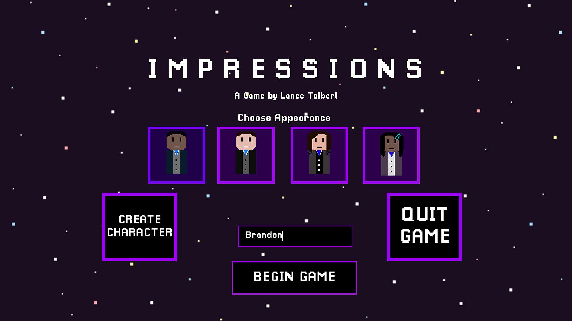 Impressions is a game about thoughts placed within the context of a science fiction short story. The game is split into four days, with each day starting by having you review the news of the day. Use this and some thoughts from people on social media to construct your own opinion on the discovery of aliens. When you're ready, the show will begin and you can broadcast your thoughts to the entire world. What you say will affect the story and world around you. Sometimes those consequences are felt immediately, and other times you don’t see the end result of your decision till much later. Think carefully but quickly. STREAM 47A won't wait around for you, so if you wait too long to answer the game will make a decision for you.