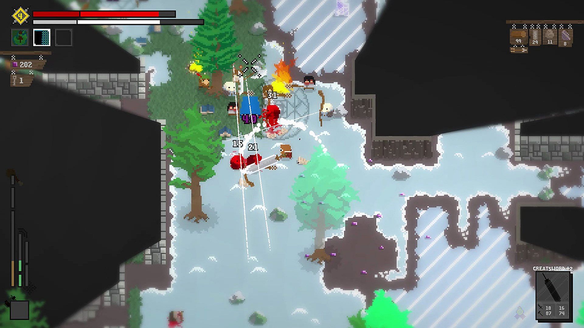 In Celebration of Violence is a fantasy action roguelike of exploration and murder. Methodical combat requires that you plan your attacks, dodges, blocks, and parries while considering your opponents and the environment. Death is permanent but you can improve your stats and purchase items to aid future lives. And if things get too tough then up to four local friends can grab controllers and aid the hero as player-controlled monsters, zombies, and bandits. The World Large, procedurally generated and interconnected lands range from plains to swamps, to cities, to dungeons. These lands offer multiple paths to reach the variety of final bosses. Dungeons are a dangerous but rewarding risk. In dungeons you will have to move slowly and be on the lookout for traps and secrets while searching for the exit. Elements interact with each other and the environment. Fire reacts to the temperature, weather, and any flammable objects, especially people. Electricity will arc towards entities and is especially dangerous around water. The chances of rain or snow adjust organically to the area’s climate and can become both a hindrance and an advantage. The shrines of multiple gods litter the land. Players can choose to pray to shrines they come across to receive a variety of favors, bonuses, and items. One must choose carefully though; every god has a different price and some become displeased when their rival is the subject of worship. Some gods may also become angered by actions the player takes while adventuring, such as destroying foliage or killing civilians. Variety Scores of weapons, items, spells, and mementos are scattered throughout the world to find. One may acquire a powerful enchanted ballista early into one life, only for the next to yield nothing more than a couple of wooden clubs. Mementos represent objects remembered from past lives and change the rules of gameplay. You may discover a memento that summons spiders from enemy corpses, improves your stats while on fire, or reverses the effects of death. There are multiple paths to victory. One could be nimble and stealthy, charge in waving a hammer, raise an army of undead, harness a variety of spells, manipulate enemies into traps or flames, amass resources to acquire the most powerful items, or simply play it safe with a sword and a shield. The various characters simply offer different starting points, every decision is your own. Challenge No life is predetermined for success. The cheery graphics disguise a brutal and unyielding experience. Unforeseen obstacles will need to be dealt with in real time and even a regular enemy will be deadly if you’re not careful. To reach the end, players will need to demonstrate that they are able to consistently overcome these obstacles. Failure can halt or even reverse progress. As you accumulate experience, discover schematics, and defeat bosses you can become permanently better prepared to tackle future challenges. The choices and advantages a player has at the beginning of a playthrough will dramatically increase as they play. New characters, items, and bonuses are unlocked in ways that are only hinted at during gameplay.