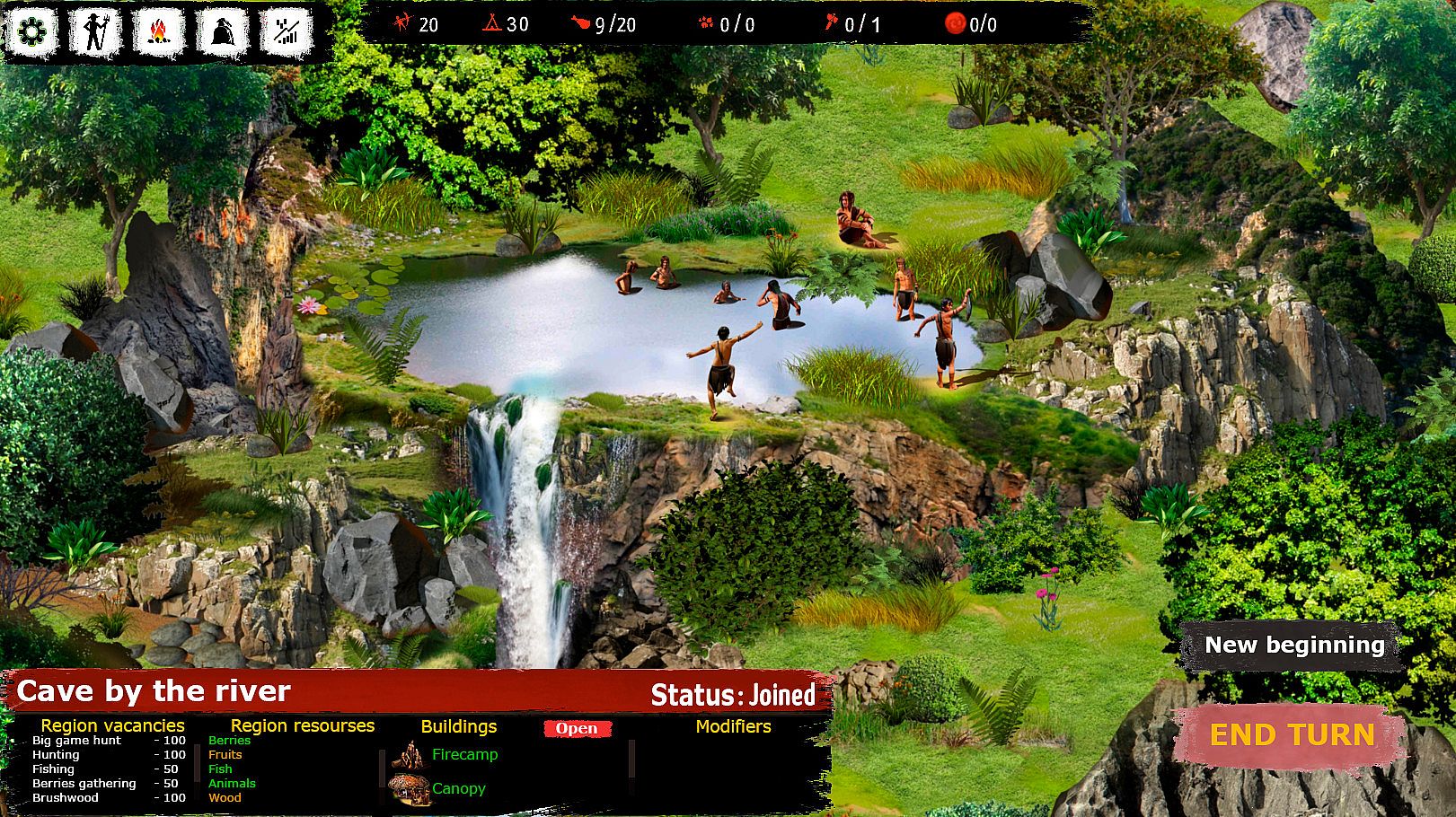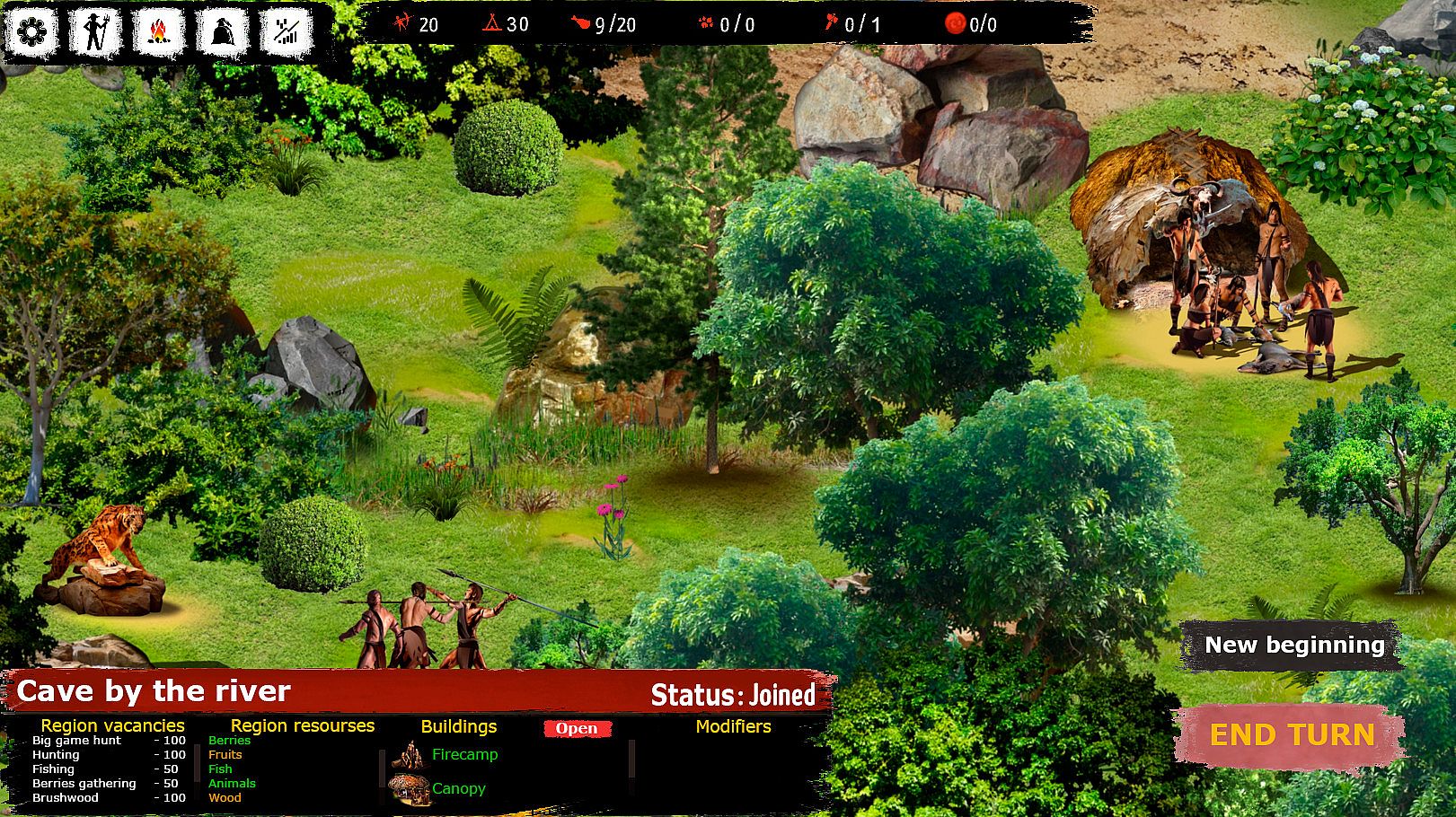 The basis of the game economy is the distribution of the tribe's labor points for various vacancies. Being engaging in any work or other activities exhausts your tribe’s resources. For survival, they need food (or they will starve), clothing, fuel for the fire. All this is mined and produced by your people, spending labor points. If the level of your civilization grows, then the the consumption rises proportionally. Keeping the balance between production and consumption is one of the tasks of the gameplay.Action - result