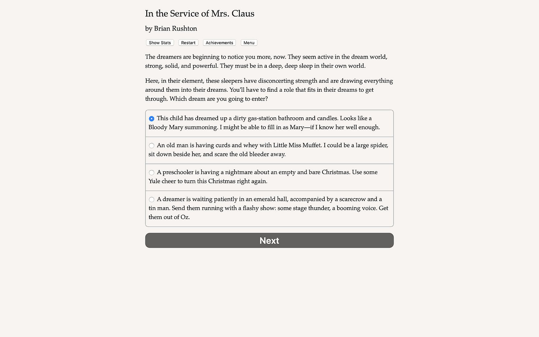 In the Service of Mrs. Claus is a 190,000-word interactive fantasy thriller by Brian Rushton, where your choices control the story. It's entirely text-based—without graphics or sound effects—and fueled by the vast, unstoppable power of your imagination.